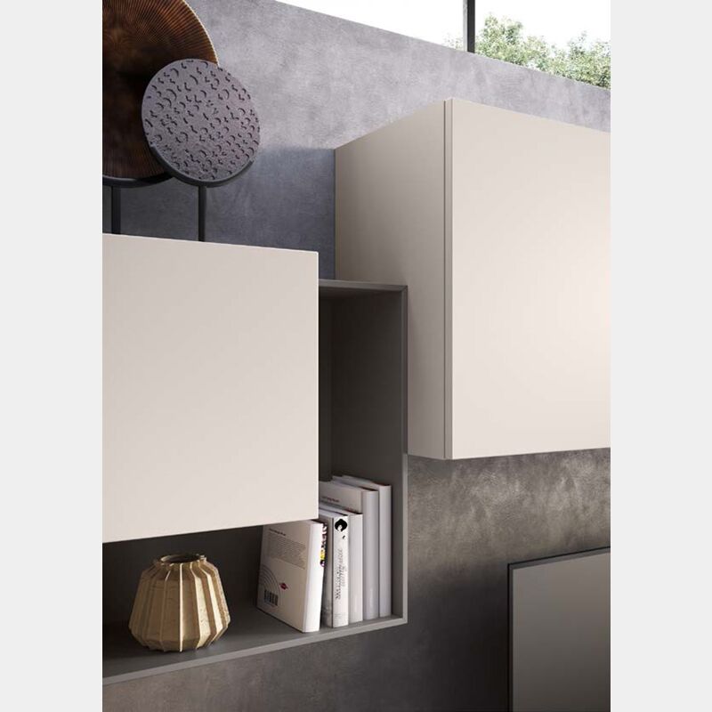 Pensata per rendere l'ambiente accogliente e rilassante la parete attrezzata Michigan coniuga l'essenza del design alla praticità di tutti i giorni. Grazie ai numerosi pensili sospesi e cassettoni risulta funzionale e capiente, non viene sminuita la parte estetica: la delicata finitura in Cachemire abbinata al Grigio londra dona alla parete eleganza e raffinatezza.