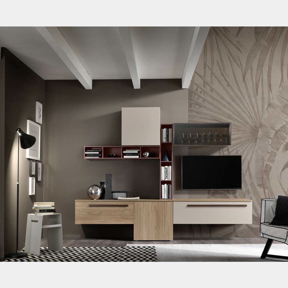 Parete attrezzata moderna Nyasa in finitura Cachemire, Noce naturale e Rosso siena