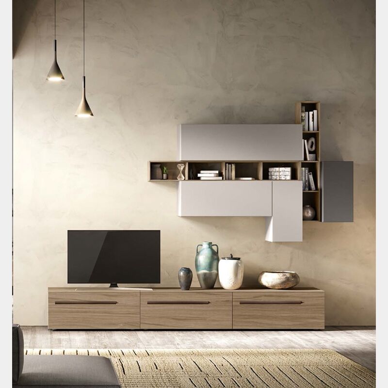 La parete attrezzata Powell è formata da una base porta tv composta da 3 cassettoni in Noce naturale con maniglie in metallo brunito, da 2 pensili verticali uno in finitura Cachemire e l'altro in Grigio londra, 2 vasistas con lunghezze differenti e 2 elementi a giorno posti perpendicolarmente in finitura Noce naturale.