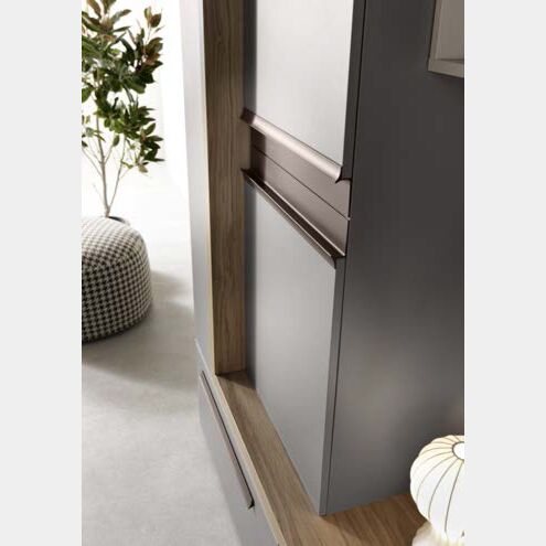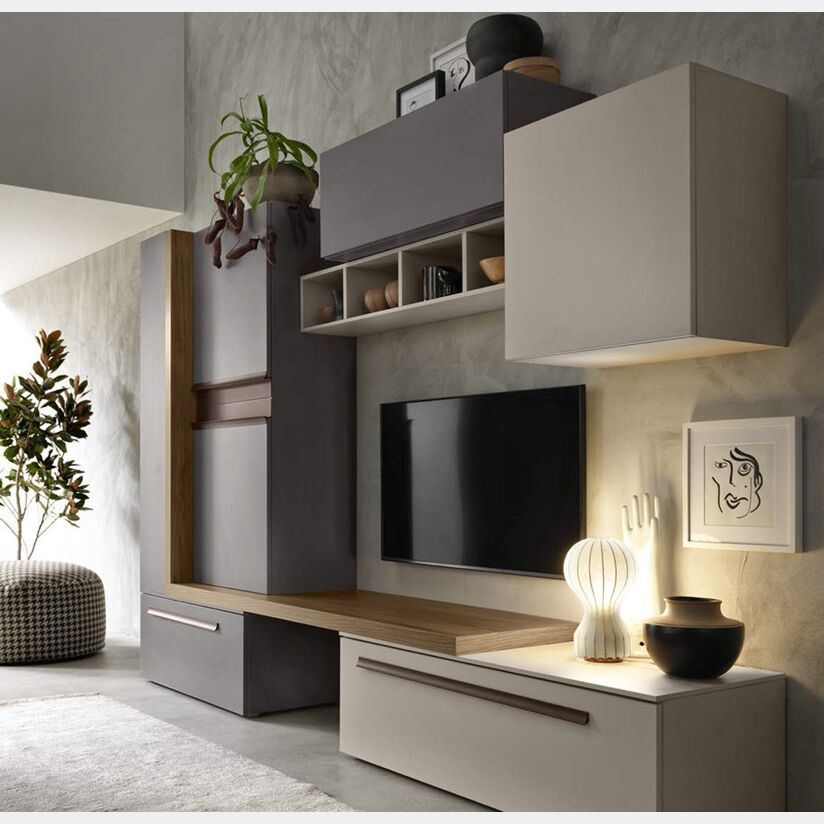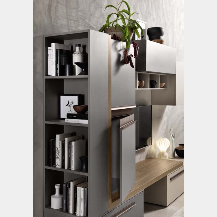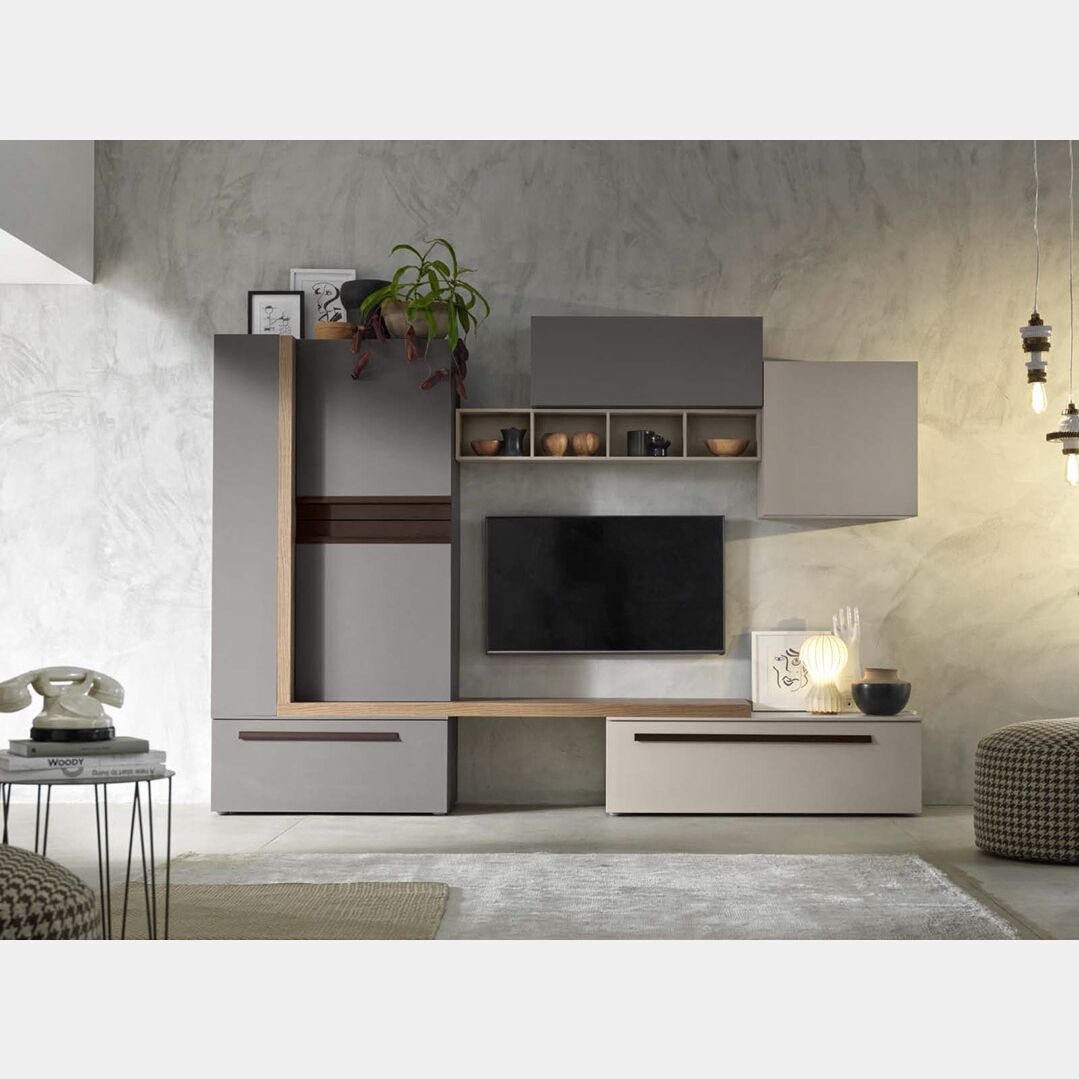 La parete attrezzata è formata da una base composta da 2 elementi con 1 cassetto ciascuno, uno in Cachemire e l'altro in Grigio londra e un mensolone in Noce naturale che si congiunge a un top posto verticalmente tra un pensile con 2 ante in Grigio londra e una libreria laterale, sempre nella stessa finitura. E' previsto inoltre un pensile vasistas, un cubo con un'anta con apertura a destra e un elemento a giorno orizzontale con 4 vani.