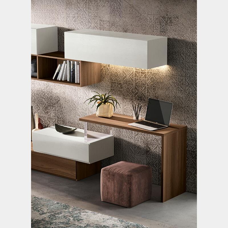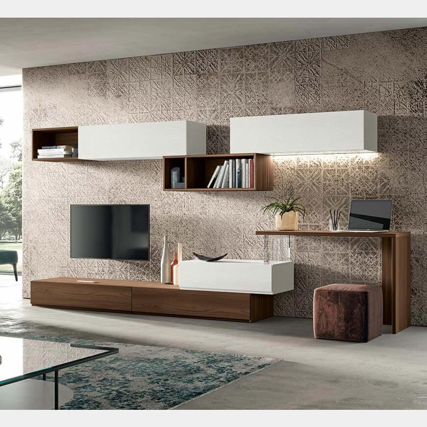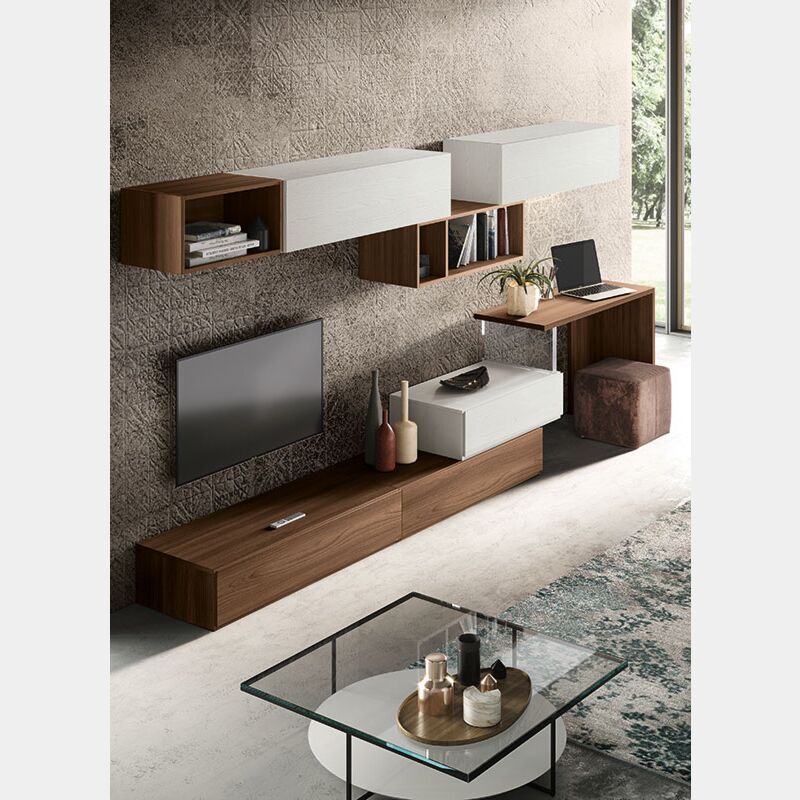 La parete è formata da 2 pensili vasistas, 2 elementi a giorno, una base porta tv con 3 cassetti totali e una scrivania. Il meccanismo di apertura delle ante è il push and pull, i cassetti hanno il sistema di chiusura ammortizzato.