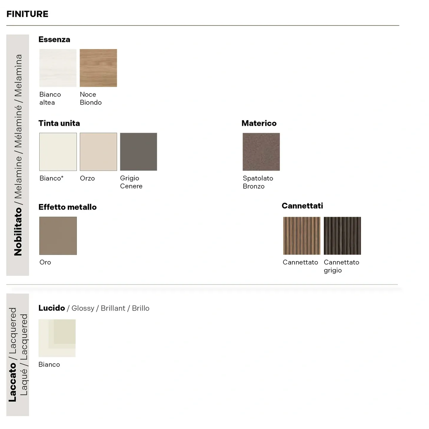 Dotazione standard: attaccaglie a muro, ferramenta di serie per montaggio battente, basculante, ribalta; piedini per montaggio elemento a terra. Cerniere non ammortizzate. Prodotto fornito smontato.