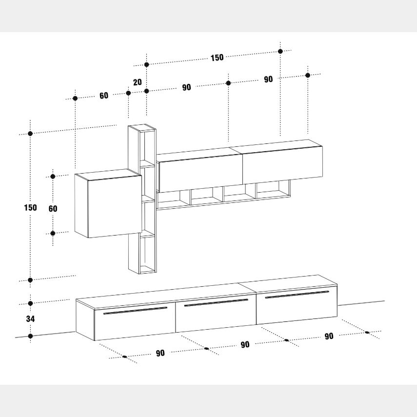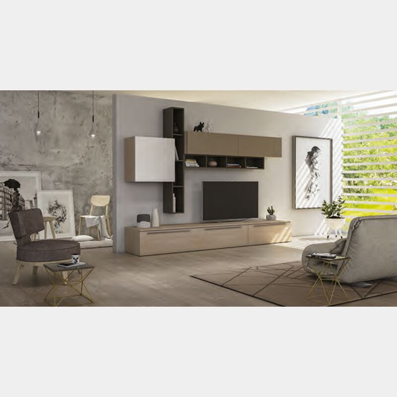 La parete viene proposta con struttura in finitura Olmo Perla,frontali elementi sospesi in finitura Bianco seta e Visone.