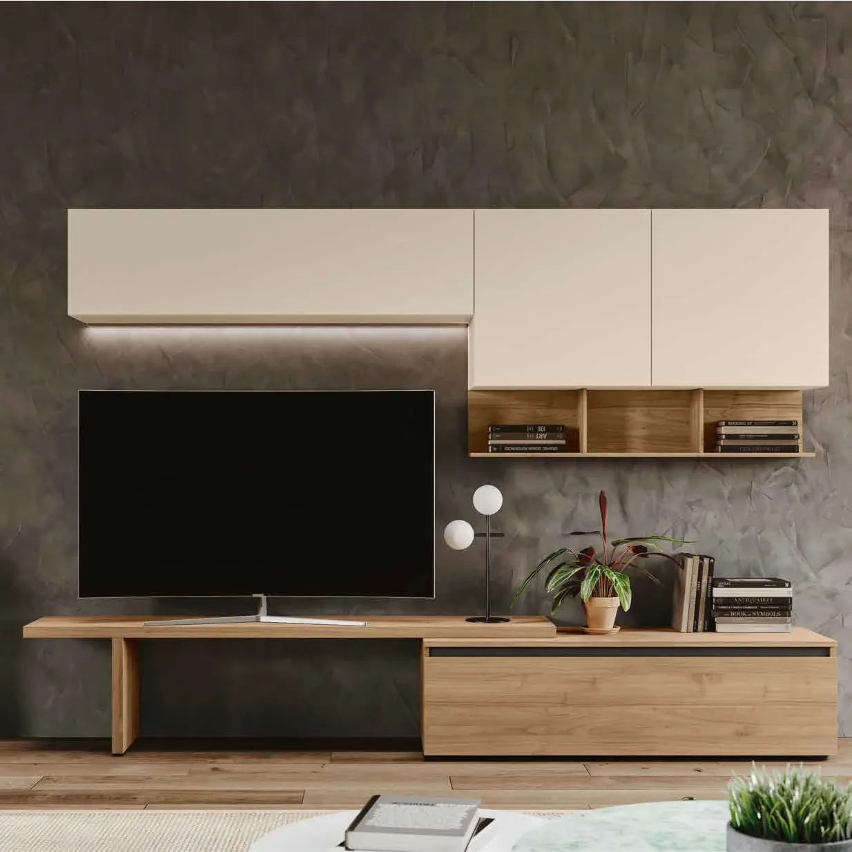 Questa parete attrezzata è una soluzione versatile e di design per arredare il tuo soggiorno. La combinazione di finiture e la modularità la rendono un pezzo unico che può essere adattato a qualsiasi ambiente. Scopri tutta la collezione Easy!