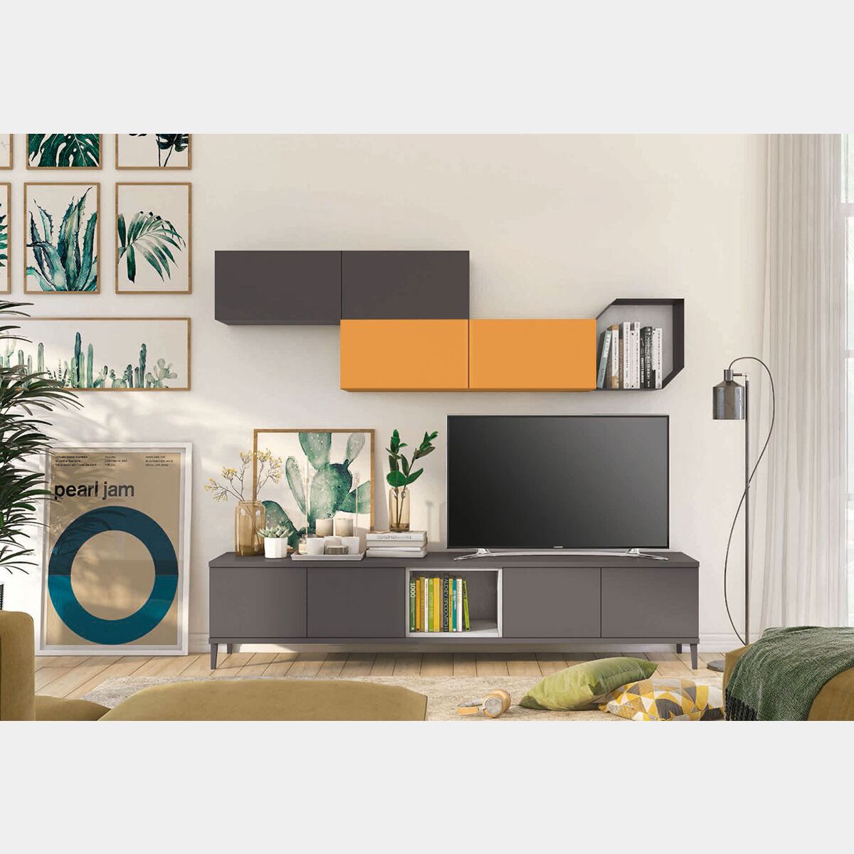 Parete attrezzata per la zona living, Grigia titanio con pensile Papaya