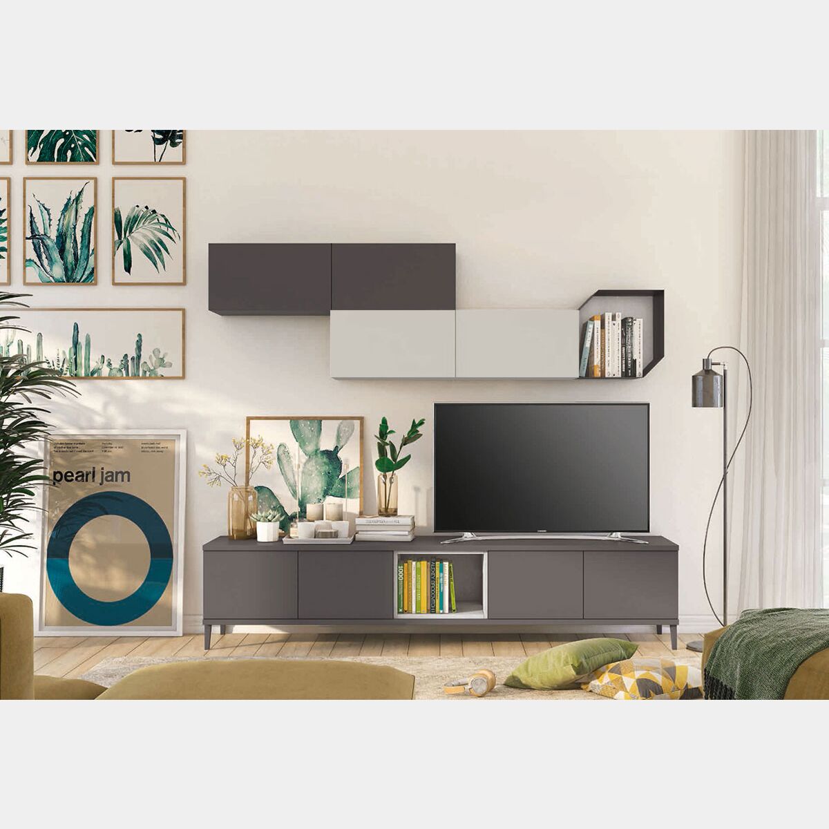 Parete attrezzata per la zona living, Grigia titanio con pensile Grigio dorian