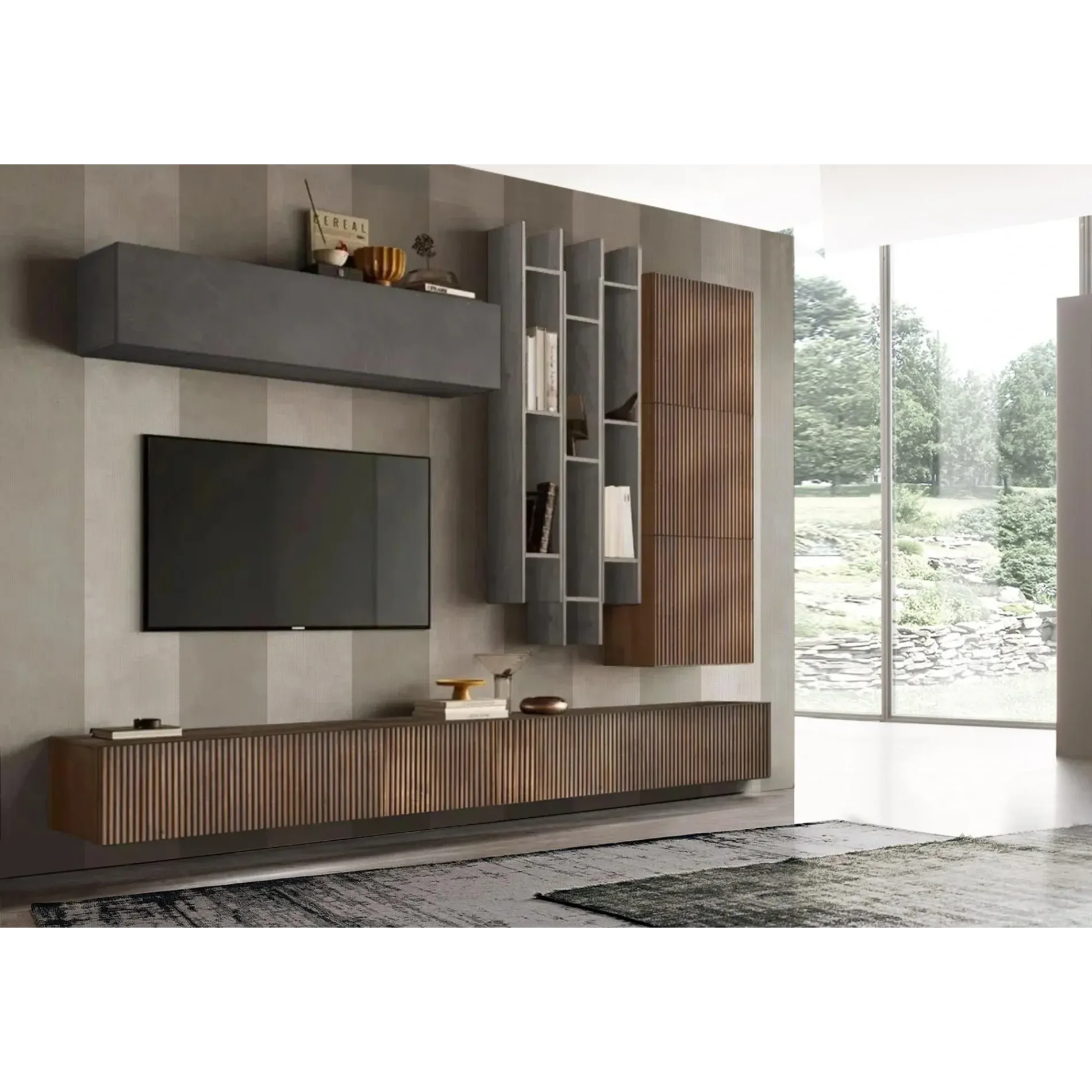 Parete attrezzata 276x30x210 h cm, Piombo e Mercure cannettato, collezione Logica Zenzero Shop parete cannettata sospesa online composizione parete sospesa scontata portata massima per cubo sospeso l. 55 cm portata massima per ribalta / vasistas sospesa l. 138 cm portata massima e rotazione libreria orizzontale