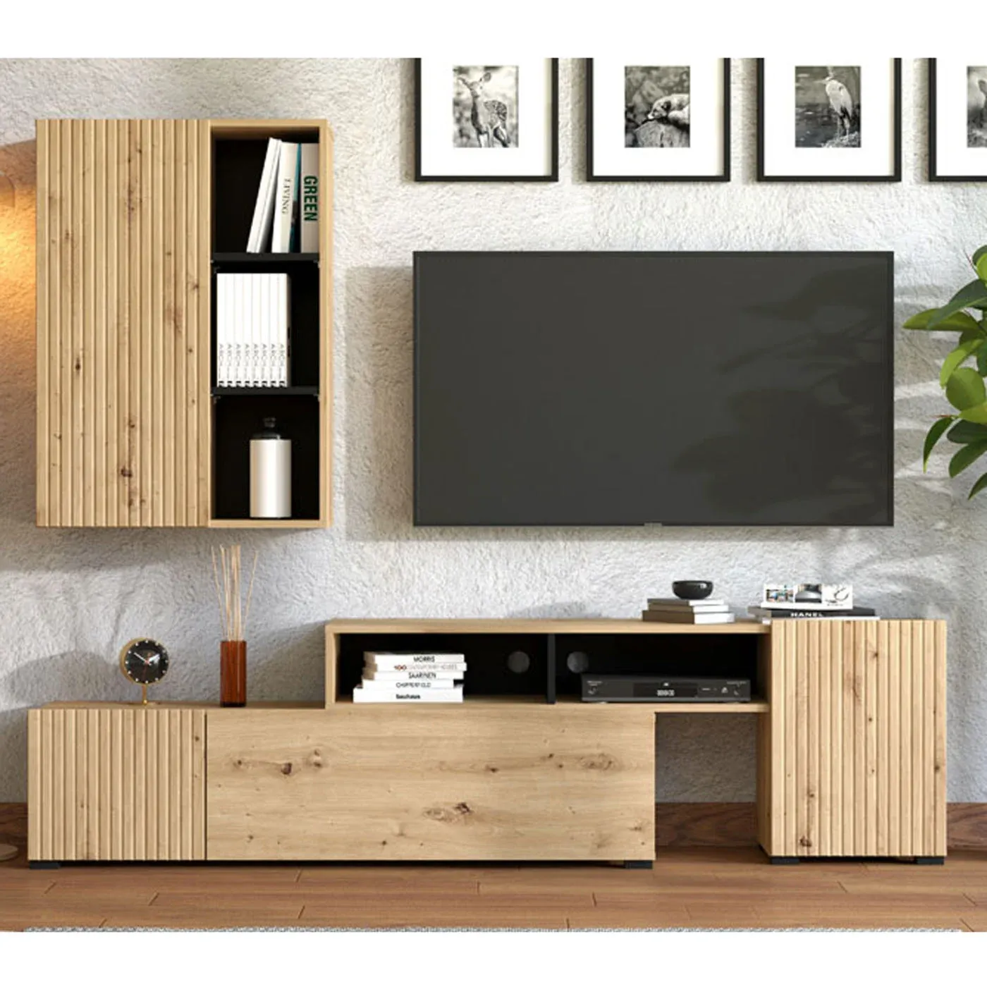 Innovativa parete attrezzata dal colore Nero e Rovere con effetto cannettato stampato. Il mobile è composto da materiali di qualità che rendono la tua zona living moderna e unica.