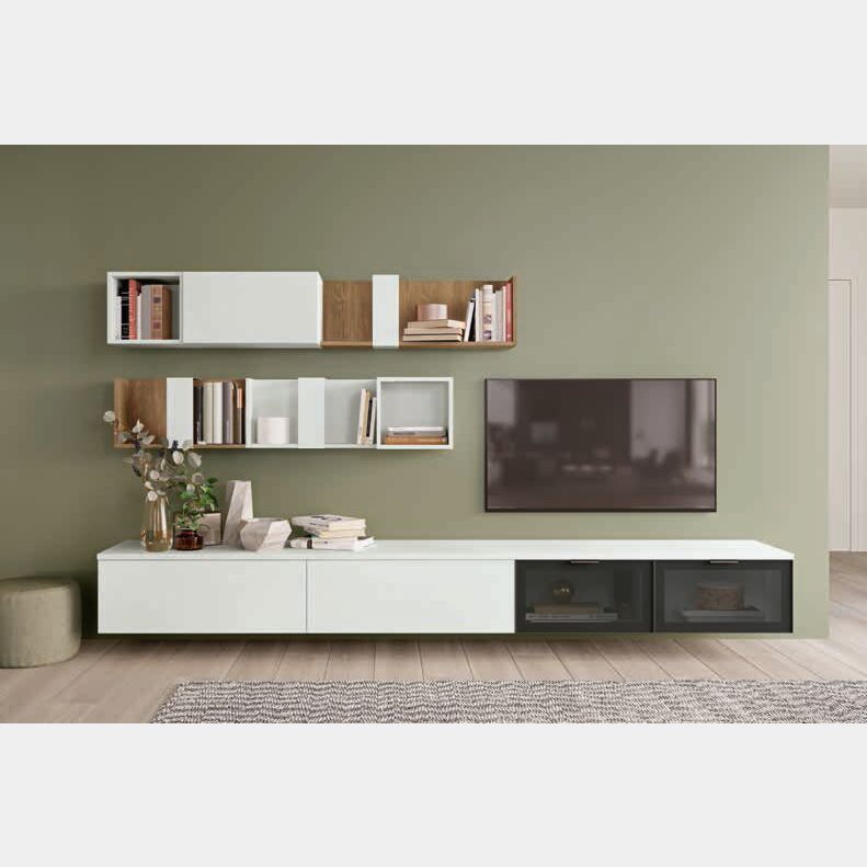 La parete attrezzata è composta da due moduli da 90 cm con anta a ribalta, due moduli ante vetro e apertura ribalta da 60 cm, due mensole di cui una in Rovere oak e l'altra in Cemento artico, una mensola maggiore in Rovere oak, un pensile in cemento artico e due cubotti, sempre in cemento artico.