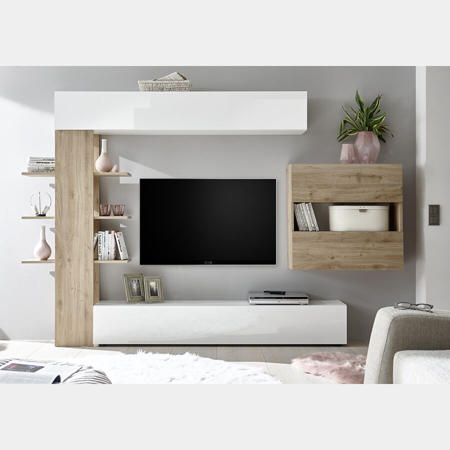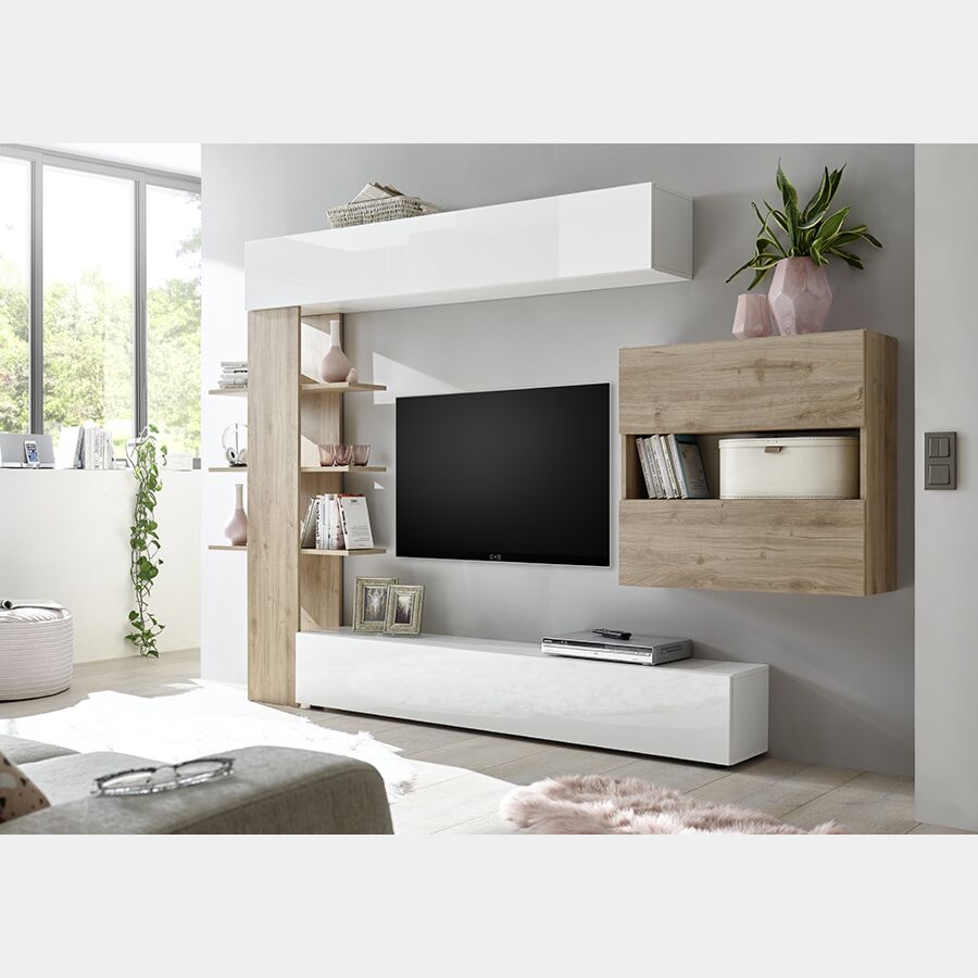 Parete attrezzata soggiorno moderna soggiorno con libreria Bianco Laccato Lucido e Rovere Cadiz