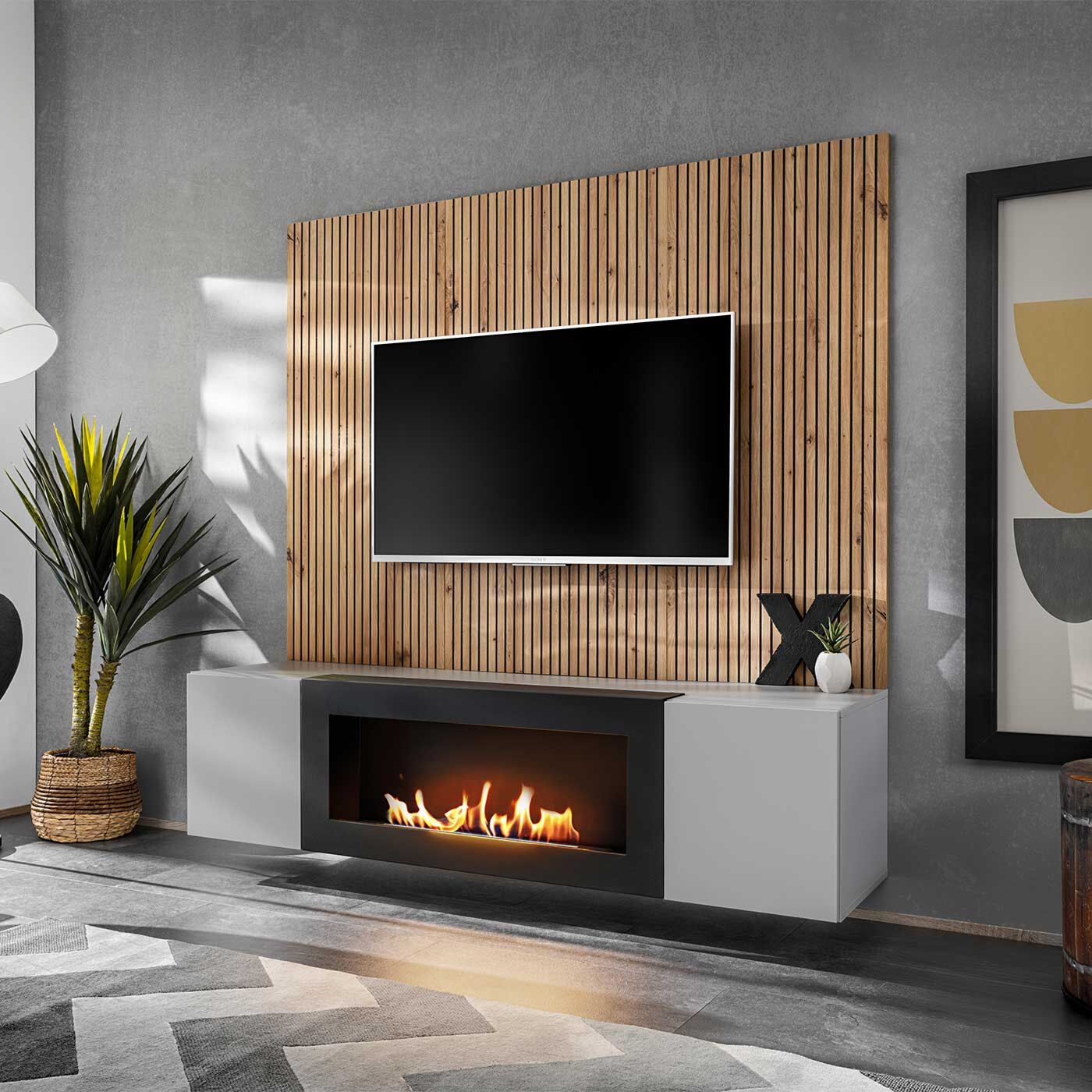 Nuova parete attrezzata in colorazione Grigio perla e Artisan oak molto fine, elegante, chic e capiente. Come si può vedere dalle immagini nel lato inferiore sono presenti 2 ante battenti, con al centro un biocamino.
