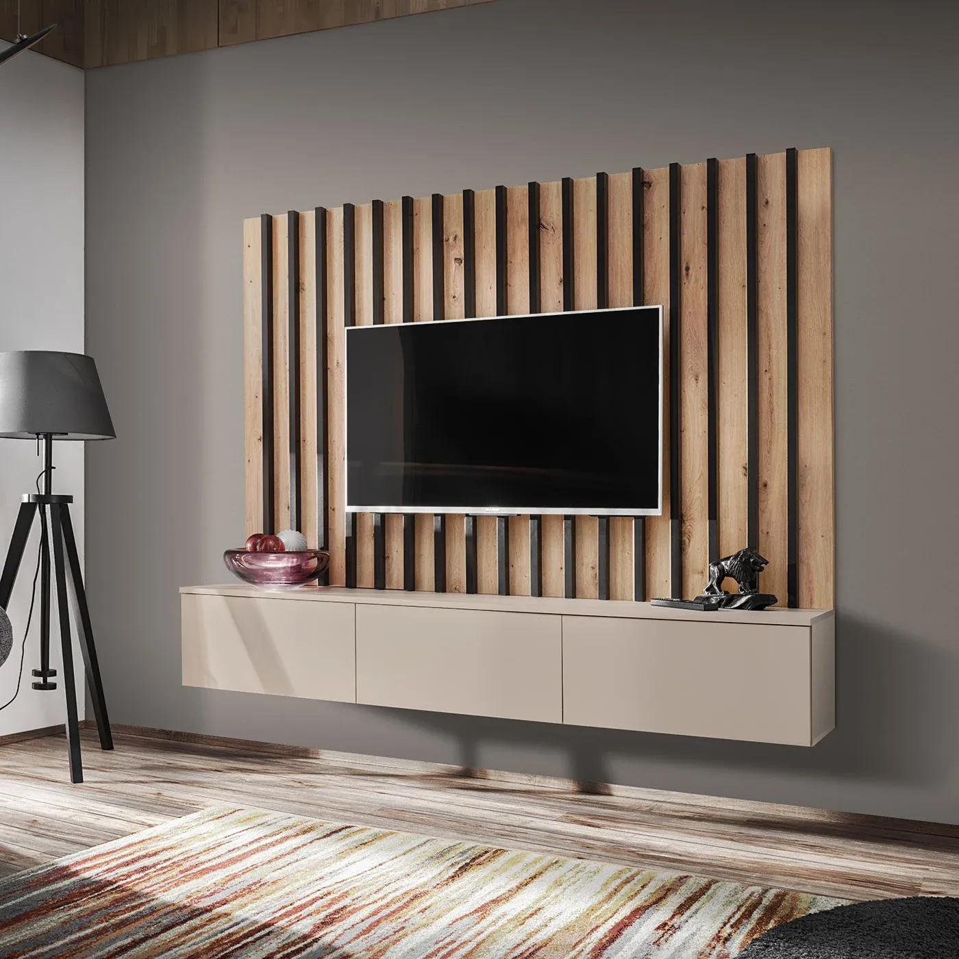 Parete attrezzata sospesa con Boiserie cannettata, 180x148x36 h cm, Cashmere e Rovere artisan