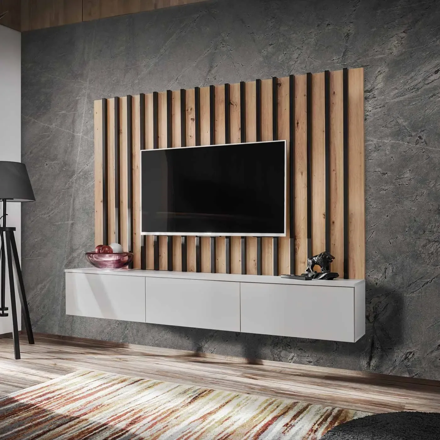 Parete attrezzata sospesa con boiserie Cannettata con sfondo in finitura Rovere artisan. Presenta poi un elegante un porta TV a 3 ante e 3 vani all'interno.