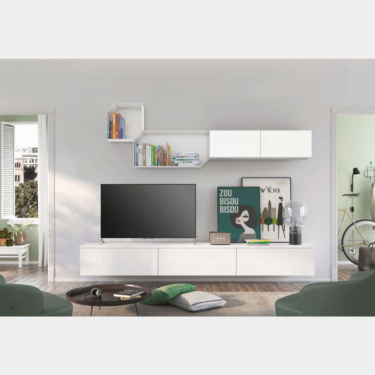 Parete attrezzata sospesa per zona living, rovere bianco e bianco opaco