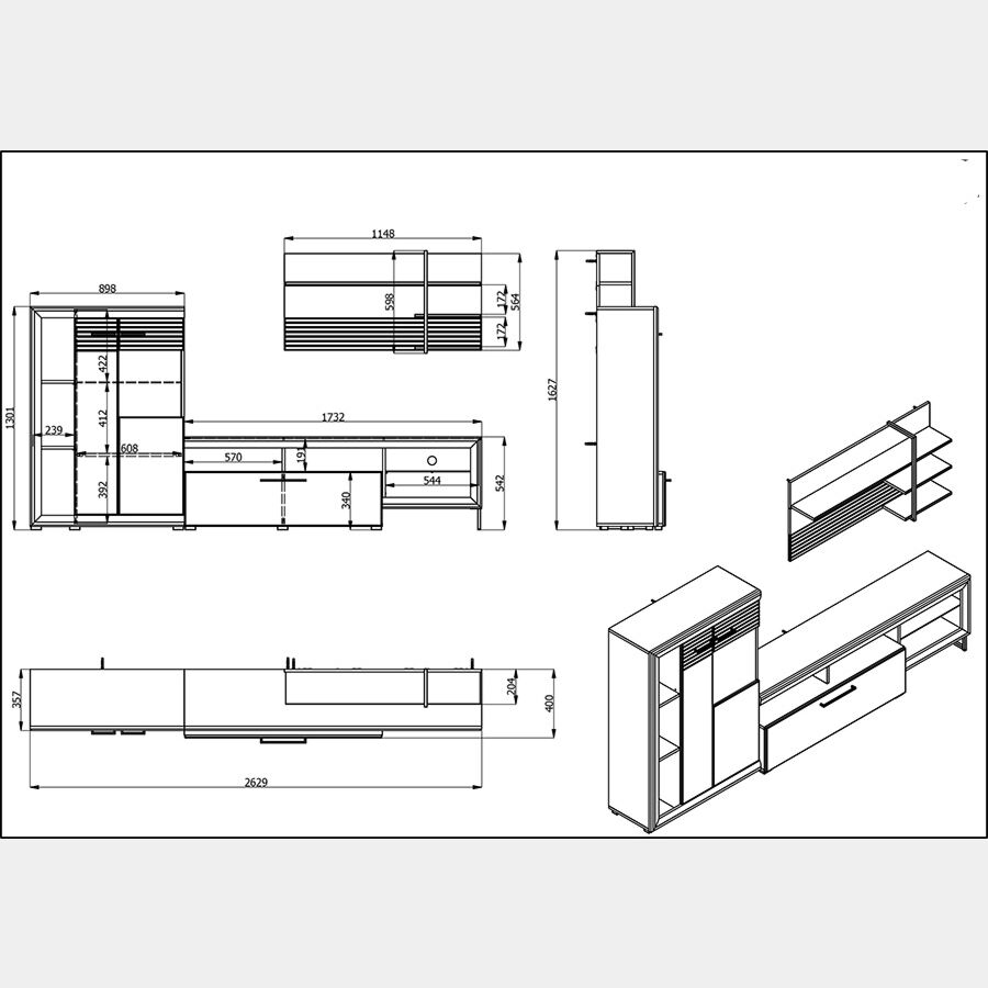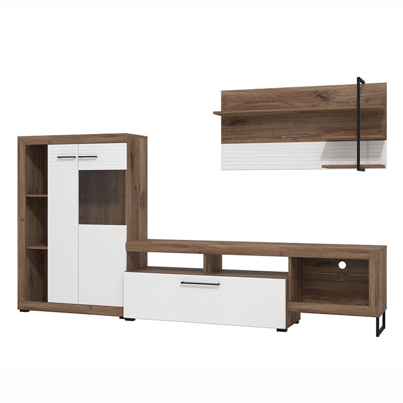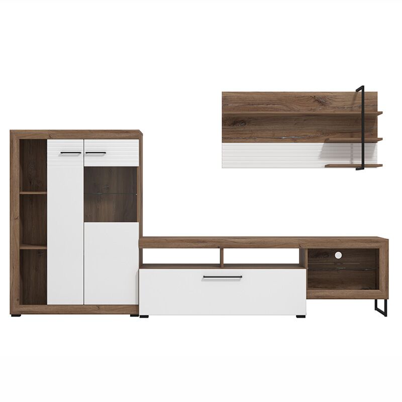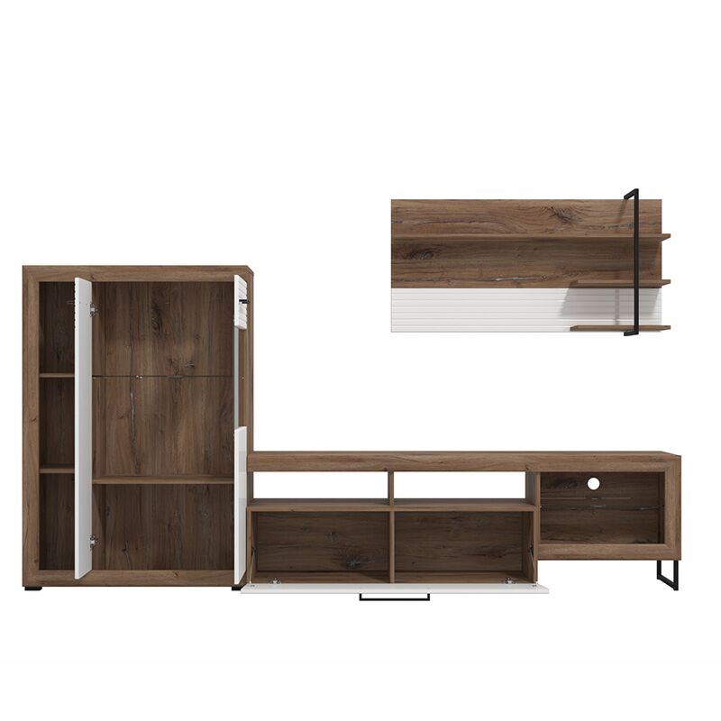La parete attrezzata è composta da un porta tv dotato di schienale con foro passacavo, una ribalta e ripiano in vetro, una mobile vetrina a due ante con 2 ripiani interni e due inferiori a vista ed un pannello attrezzato sospeso.