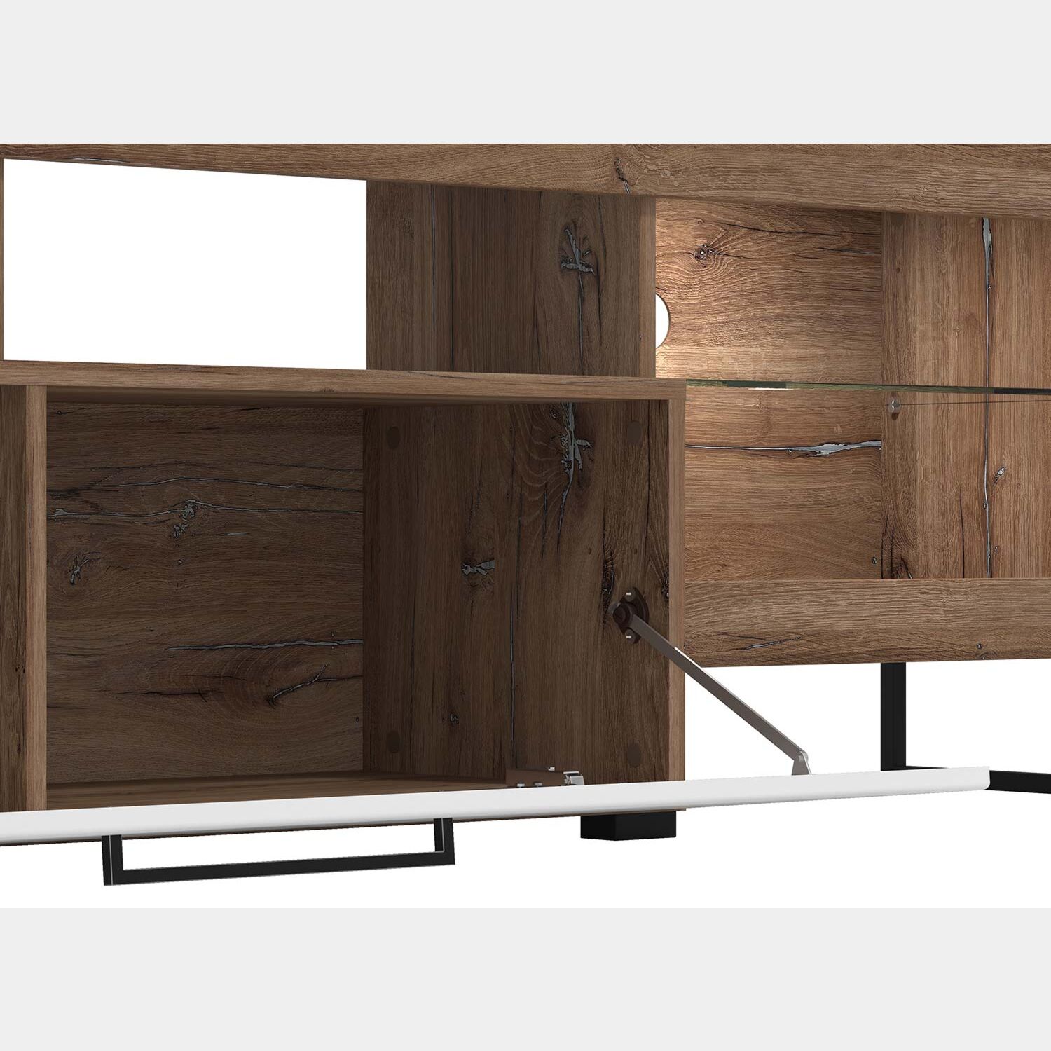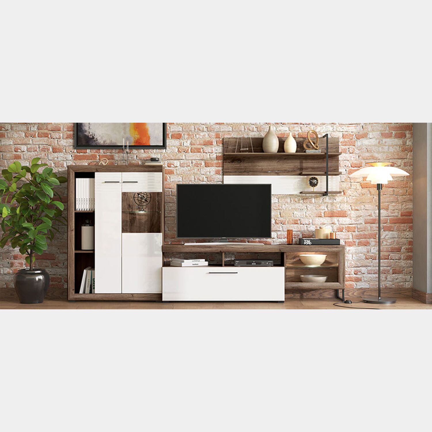 Ogni elemento è stato progettato per offire un ampio spazio cui riporre libri, soprammobili, bicchieri e molto altro. Le finiture sono Quercia e Bianco con serigrafie orizzontali, l'intenso contrasto dona calore ed eleganza all'ambiente