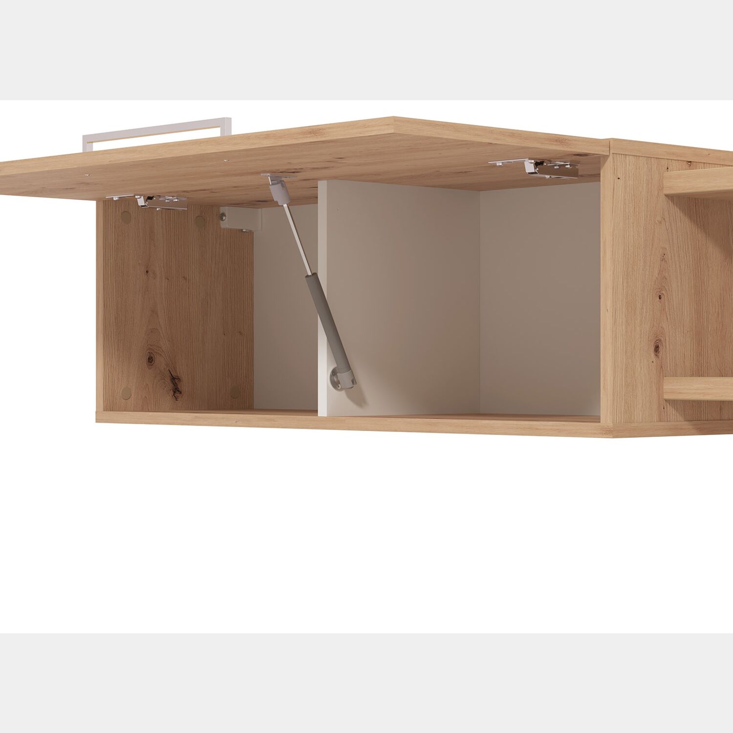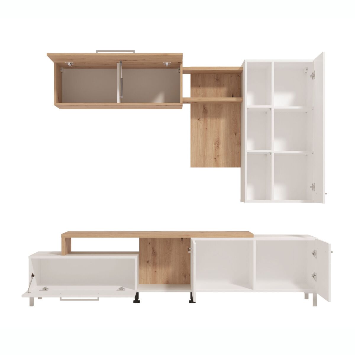 La parete attrezzata è composta da una base tv formata da 2 ante, una ribalta ed un vano a giorno, un pensile vasistas e un modulo ad un'anta con vani a vista. I due elementi sospesi sono collegati da un complemento dotato di schienale e due ripiani.