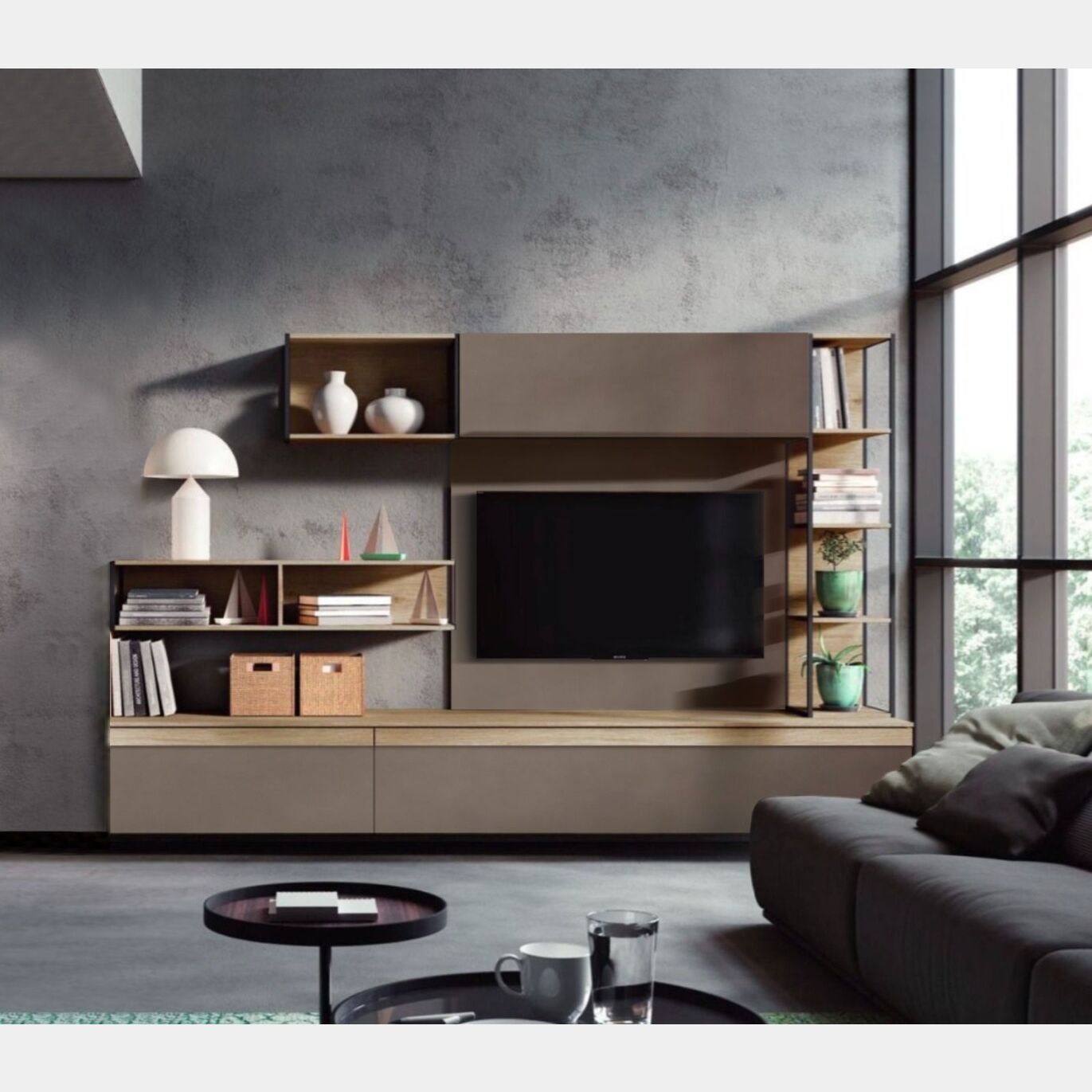 Parete industry in finitura Ossido brunito e Rovere decapato. Parete attrezzata Made in Italy di design bellissima e assolutamente di tendenza! Alta qualità e prezzo molto vantaggioso!