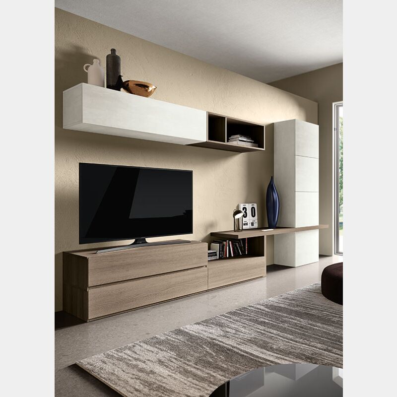 La parete è composta da una base porta tv con 3 cassetti dotati di chiusura rallentata, una mensola, un totem con 3 ante, un cubo con un'anta, un elemento vasistas e un elemento vano a giorno. Tutte le ante sono dotate di sisistema di apertura push and pull.