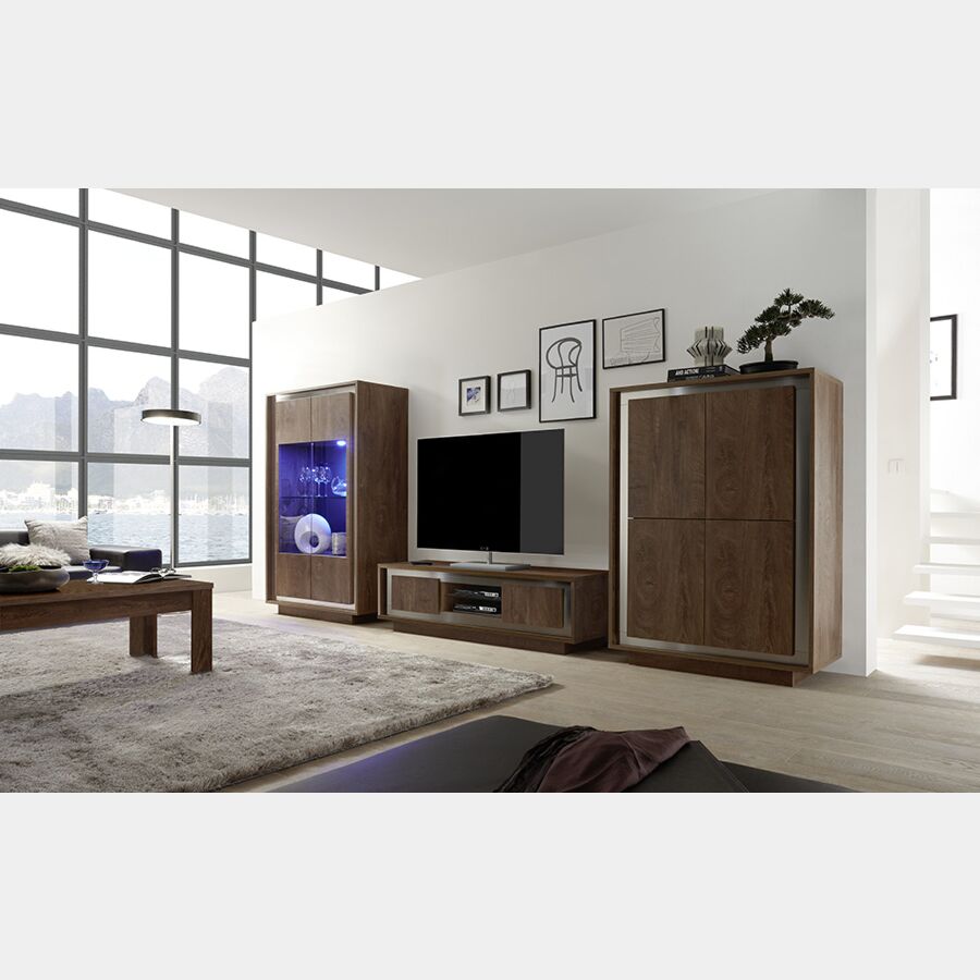 La parete per soggiorno è composta da Vetrina a 2 ante, Porta TV e Madia a 4 Ante.