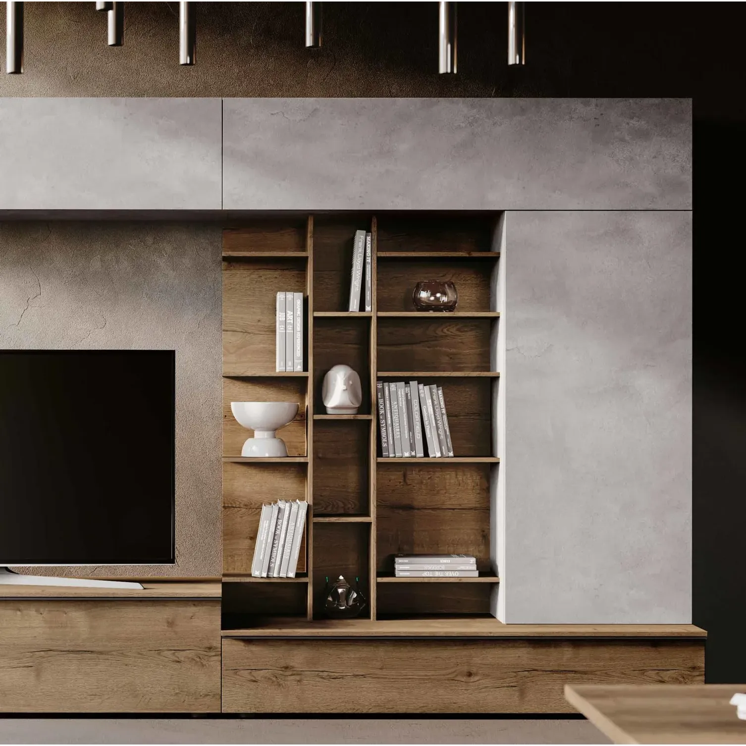 Le finiture proposte , Rovere tabacco e Ardesia cemento, creano un piacevole contrasto che valorizza le linee deliate e moderne degli elementi. Tramite configuratore è possibile personalizzare le tinte per adattarle al proprio soggiorno.