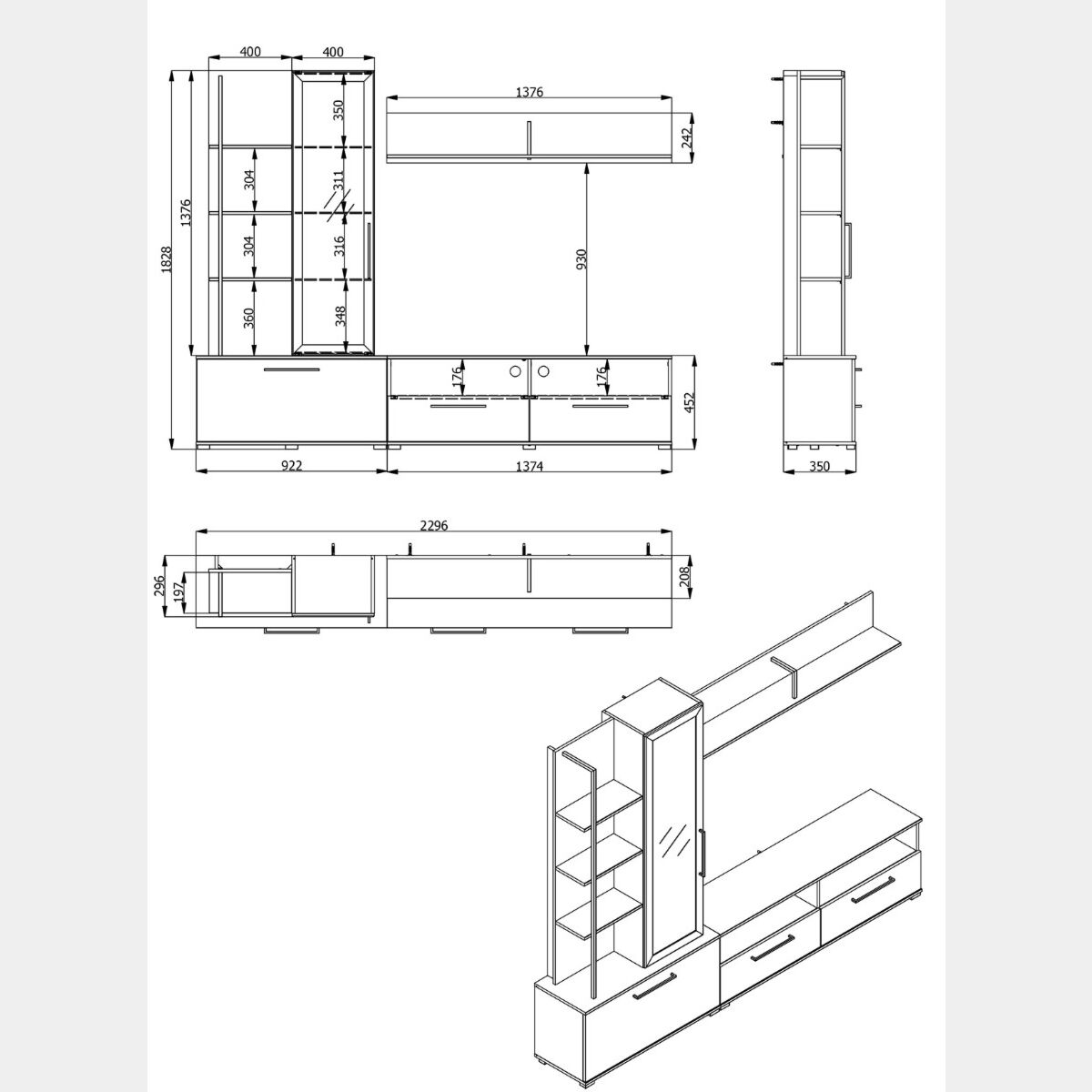 La parete attrezzata risulta inoltre una valida soluzione contenitiva per libri, soprammobili, cornici, lettori dvd e molto altro. La grande base a terra è dotata di una ribalta con divisorio centrale, due cassetti interiori e due vani a giorno superiore. Verticalmente si sviluppano una boiserie con tre ripiani, valorizzata da una barra verticale, una vetrina con tre ripiani in vetro ed una mensola.
