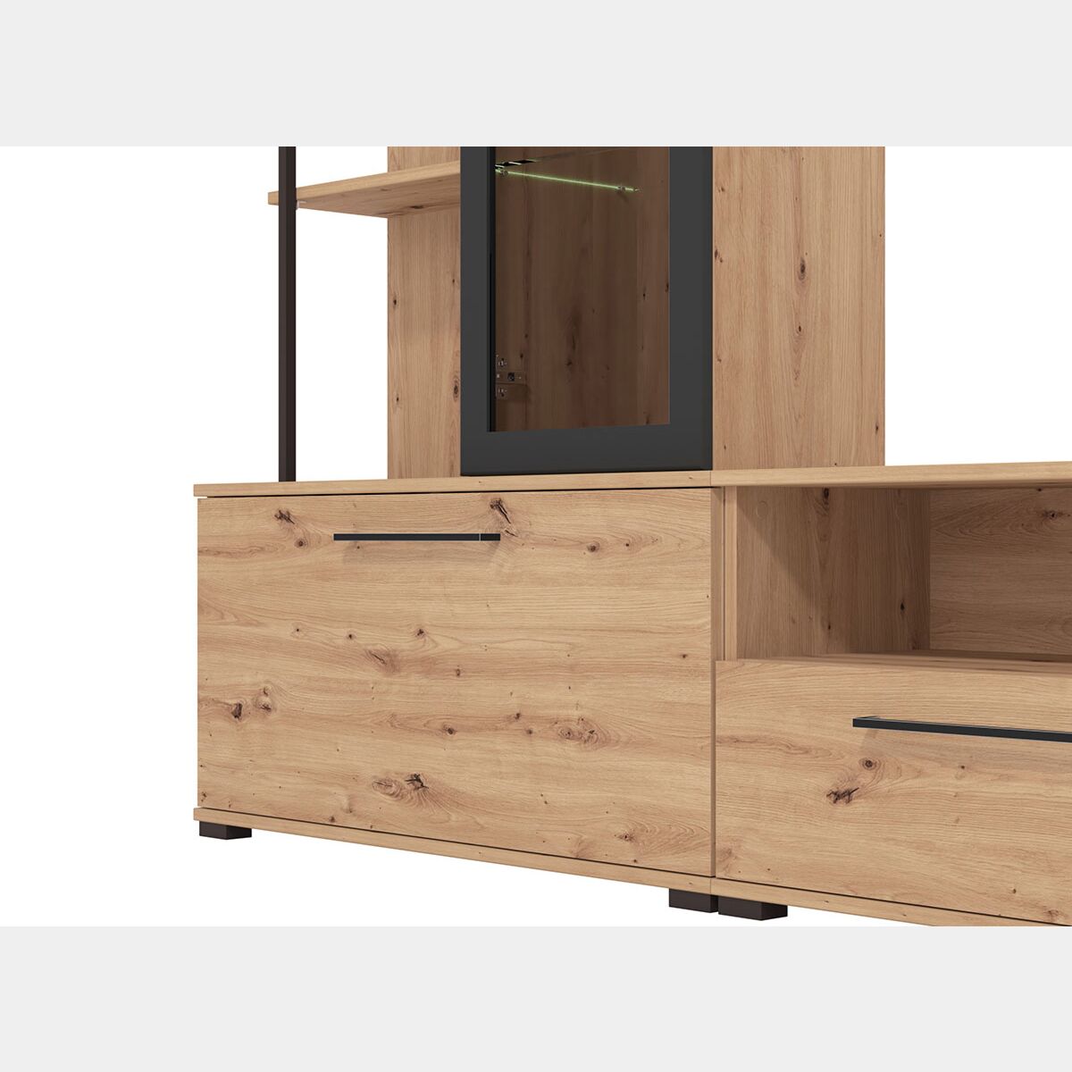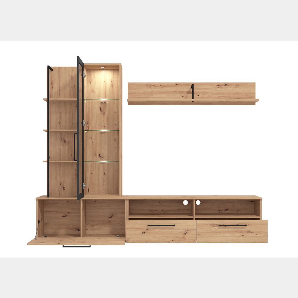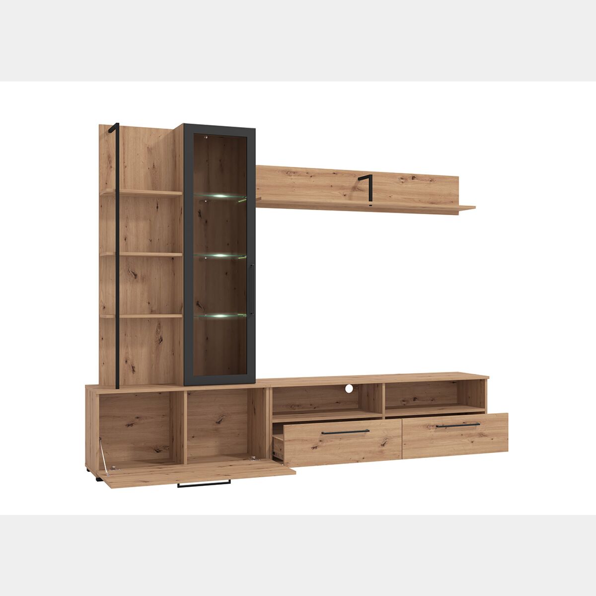 Parete con base tv vetrina e mensole finitura Rovere e Nero