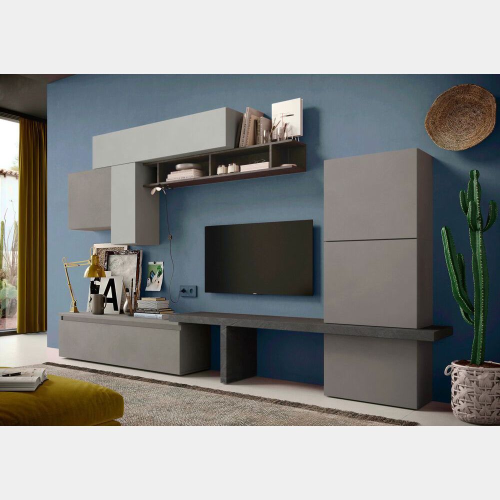 L'attenzione dei tuoi ospiti sarà catturata dalla Parete Attrezzata finitura Ardesia, Piombo e Gesso che grazie alla sua capienza e originalità diventerà la protagonista della zona living!