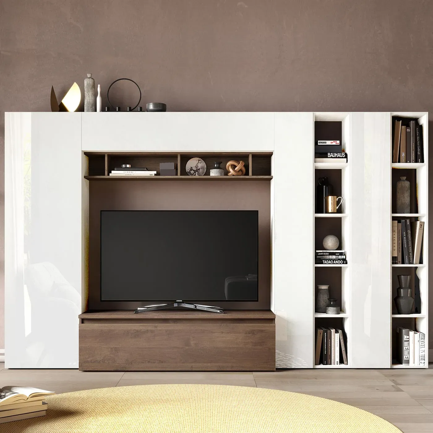 La parete attrezzata in finitura Mercure e Bianco lucido saprà donare al tuo soggiorno l'atmosfera che preferisci, e , saprà raccontare davvero tanto di te, lasciando di stucco i tuoi ospiti!