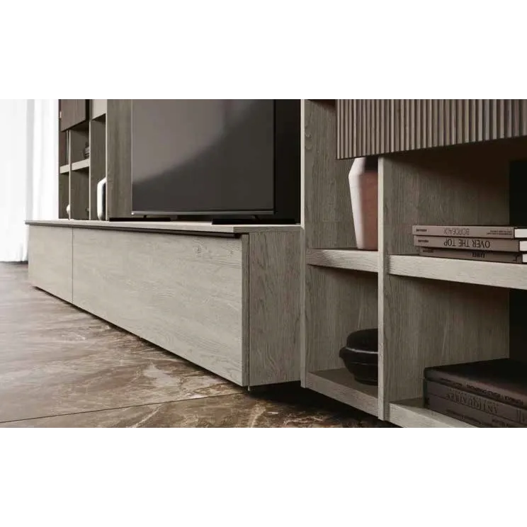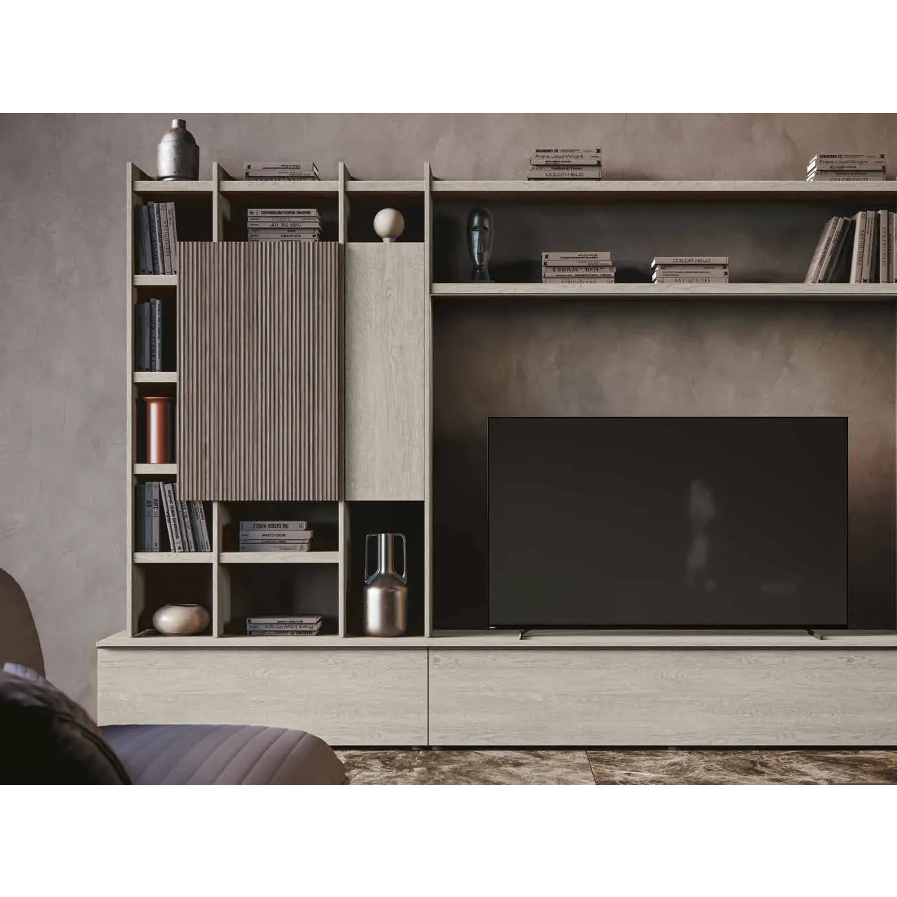 La parete attrezzata viene proposta in una calda tinta legno, il Rovere gessato, a cui viene abbinata una nuova finitura, disponibile nei frontali: il cannettato grigio.