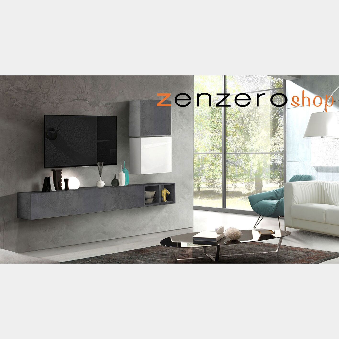 Soggiorno Zenzero, parete soggiorno bianco lucido, beton, piombo e ossido con cubi e vano a giorno