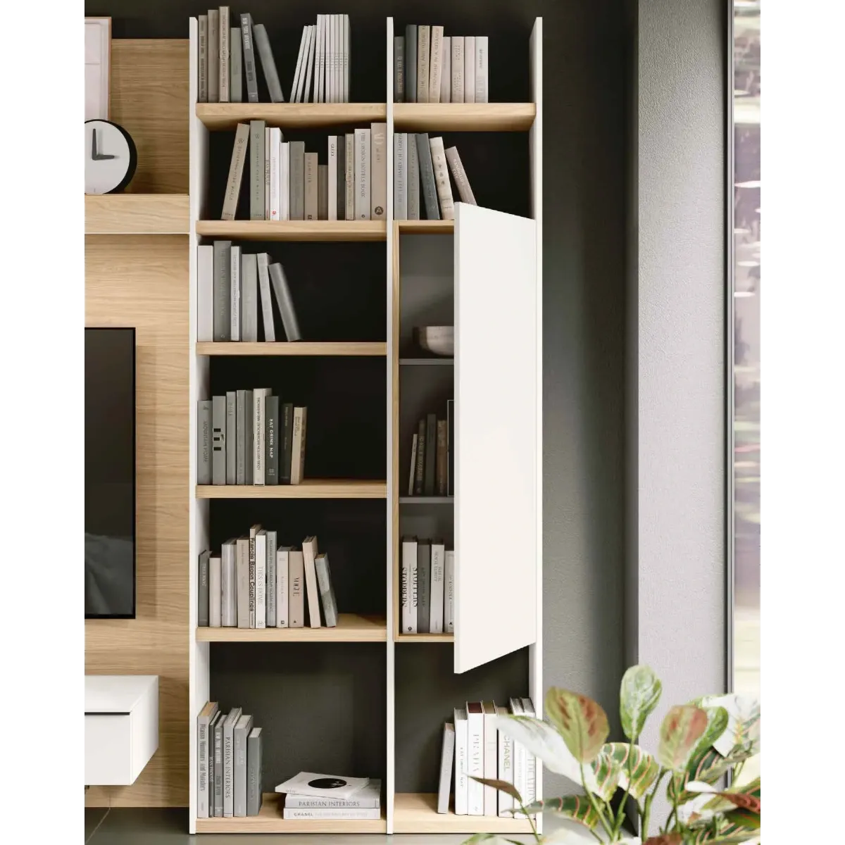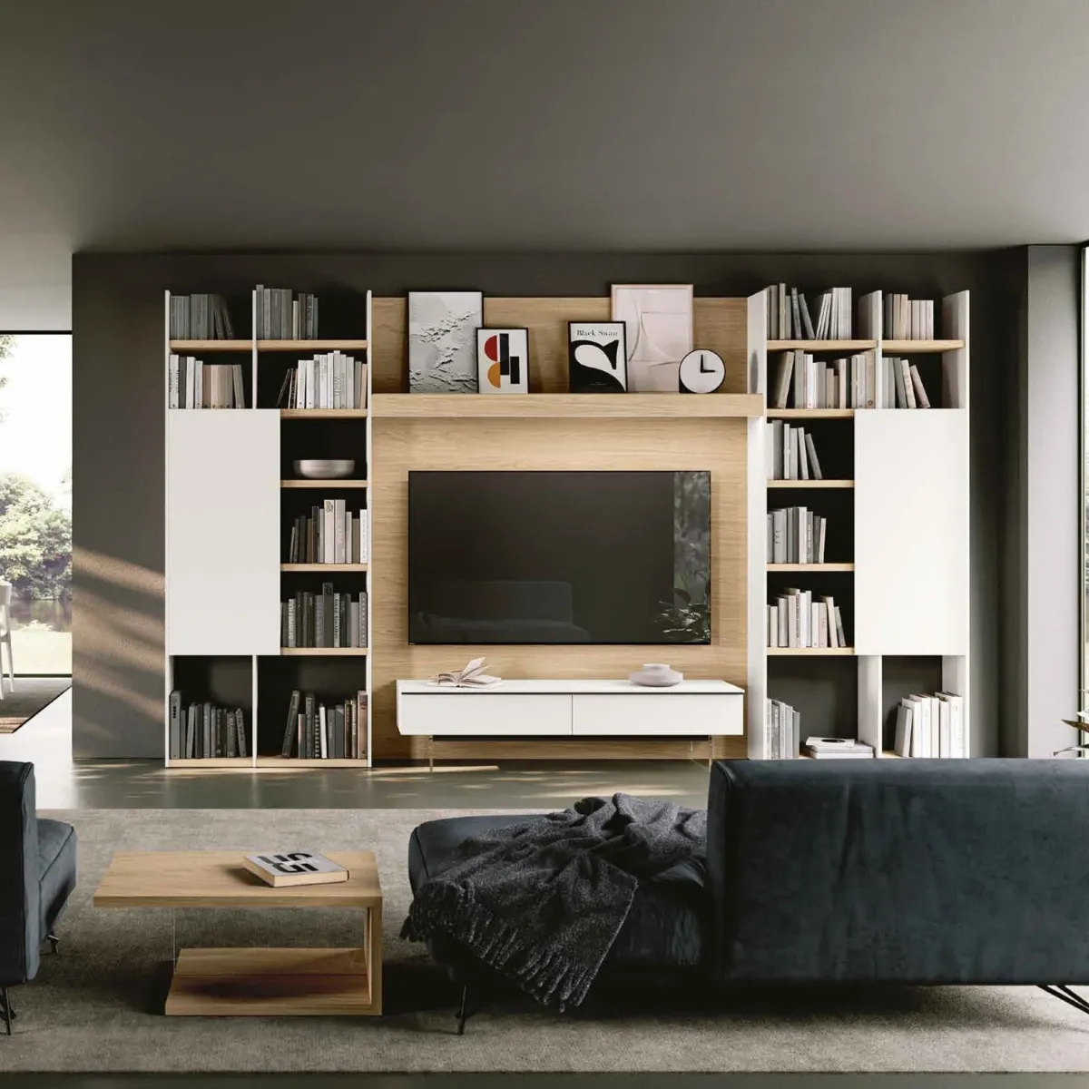 Parete soggiorno con libreria, Rovere nordico e Bianco