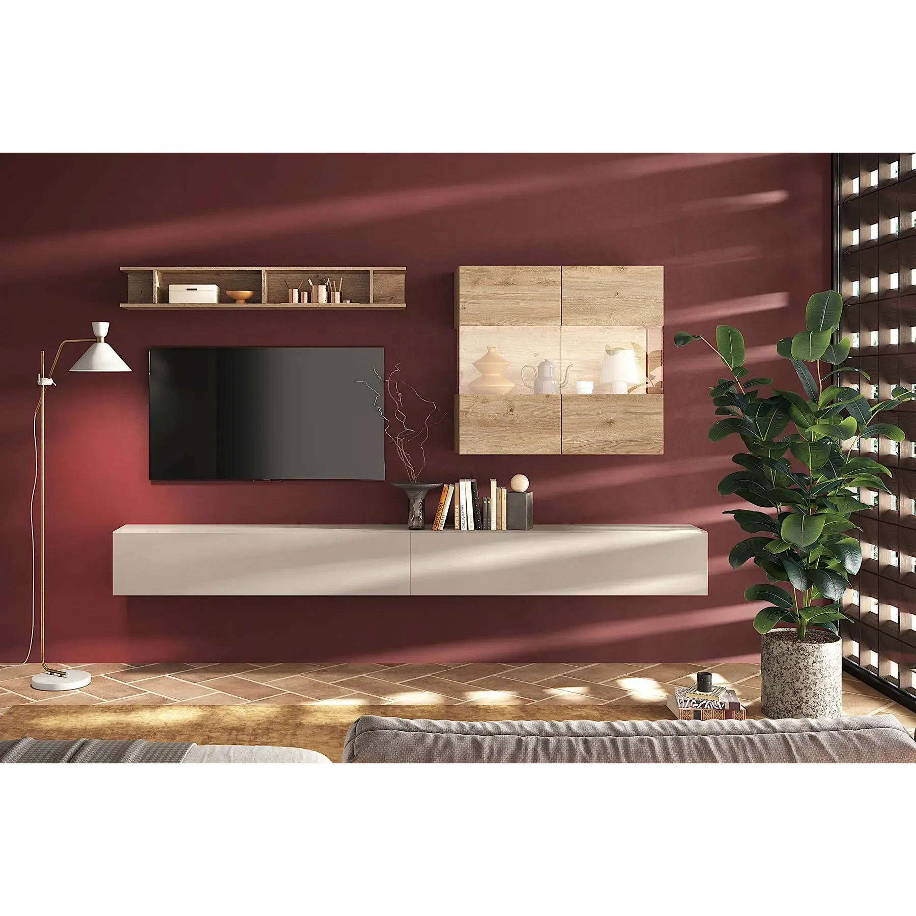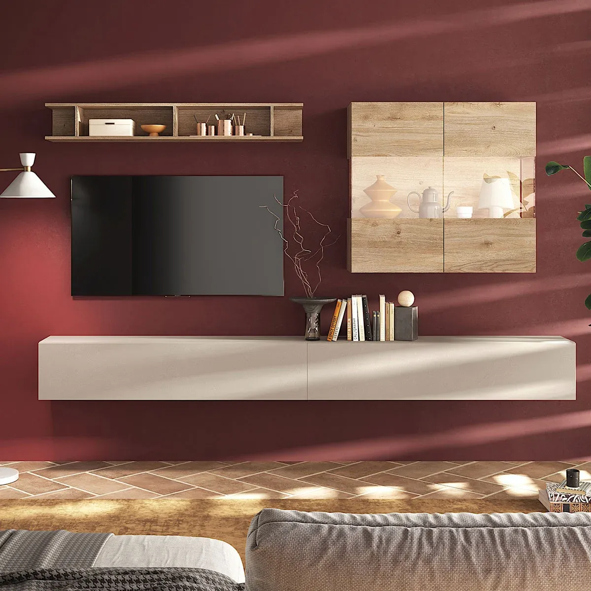 Parete attrezzata sospesa con vetrina, libreria e base, finitura Cashmere e Cadiz, personalizzabile. Aggiungi altri elementi al tuo soggiorno oppure vedi tutta la collezione Logica.