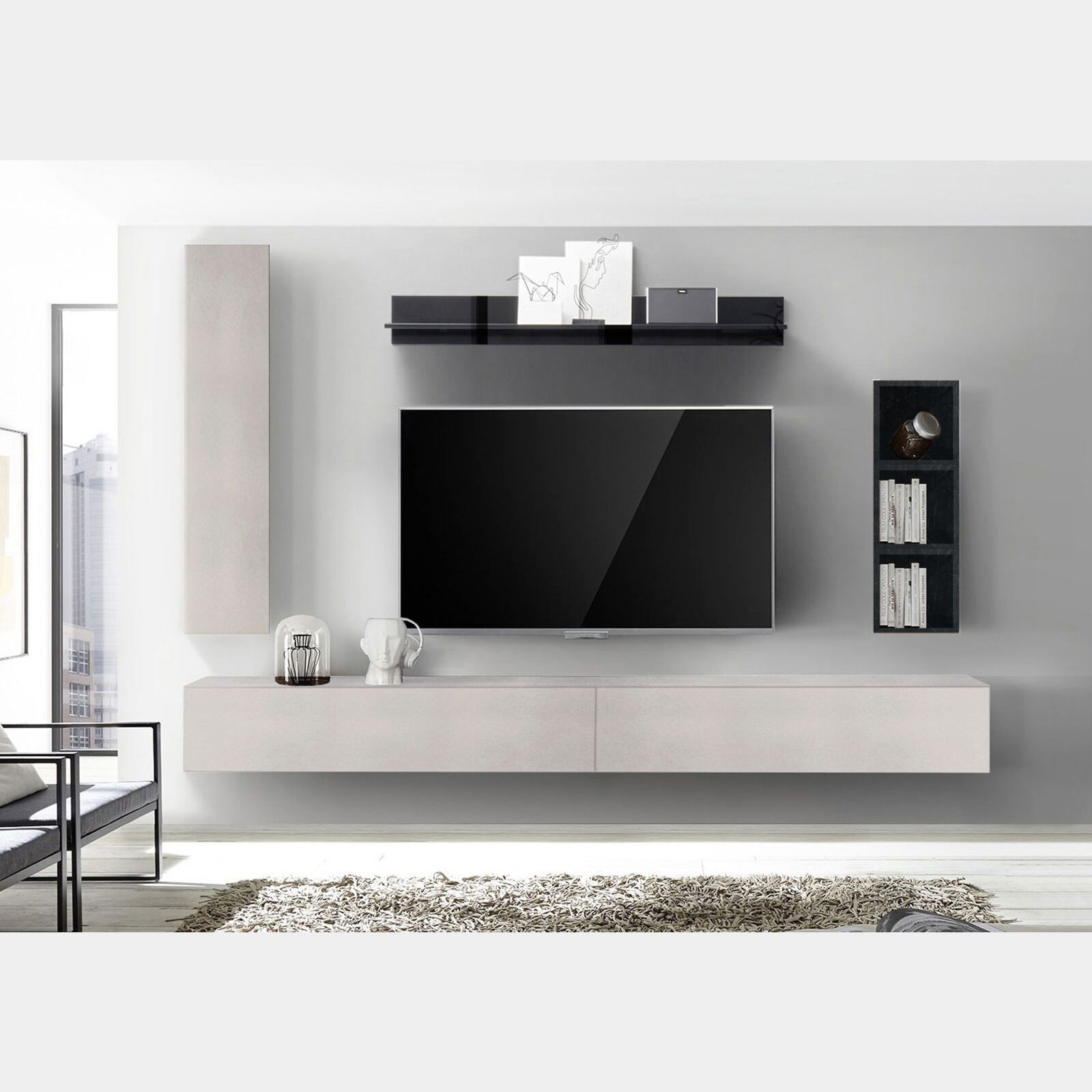 Soggiorno Zenzero parete attrezzata sospesa moderna in finitura Nero e Gesso