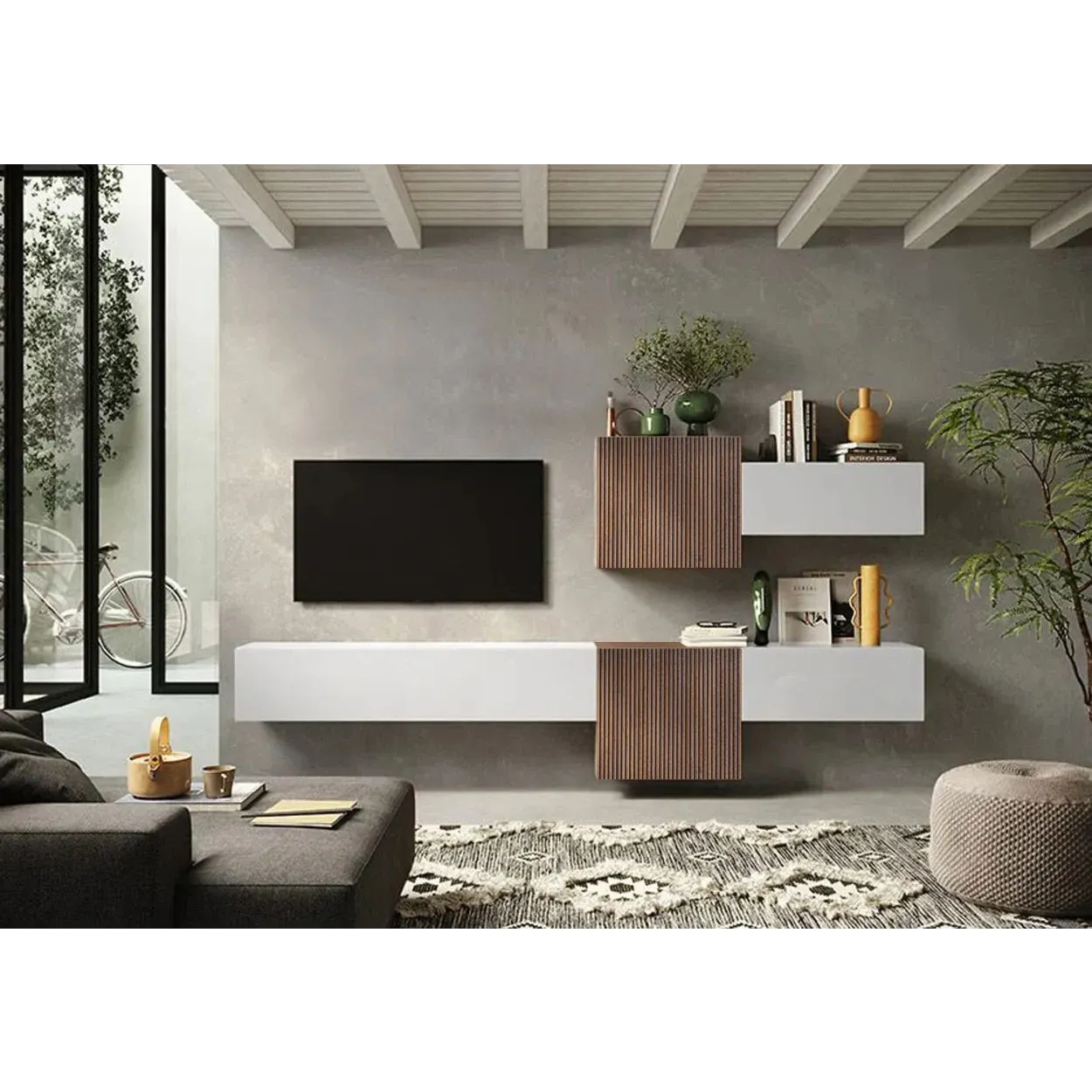 Pareti attrezzate 262x30x190 h cm, Bianco lucido e Mercure cannettato, collezione Logica