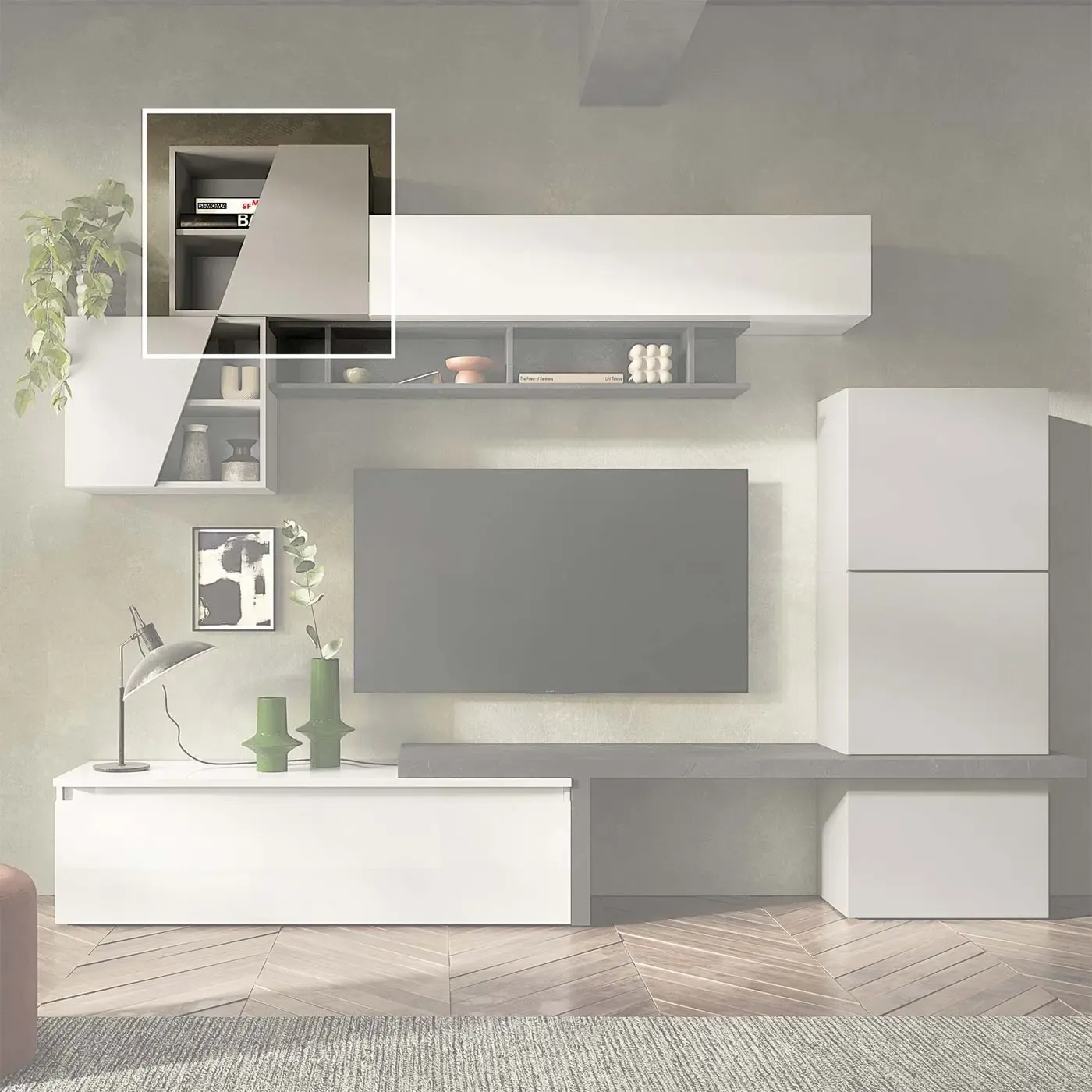 La finitura proposta Gesso, può essere sostituita con le tinte disponibili a campionario, per personalizzare al meglio il pensile, adattandolo così al proprio soggiorno.
