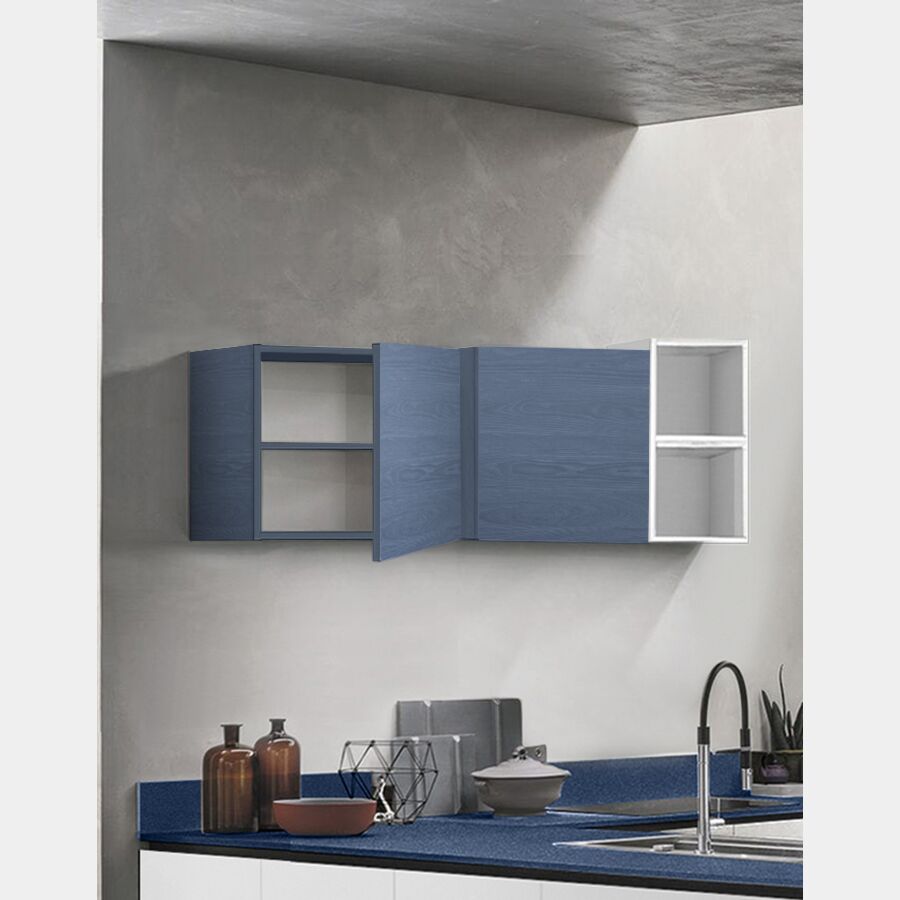 Il pensile cubo da cucina ha sia scocca che frontale in finitura Blu. Il cubo è dotato di un ripiano centrale interno che crea due vani: questa suddivisione interna fornisce un piano di appoggio per utensili vari, soprattutto per quelli che vengono utilizzati con frequenza.