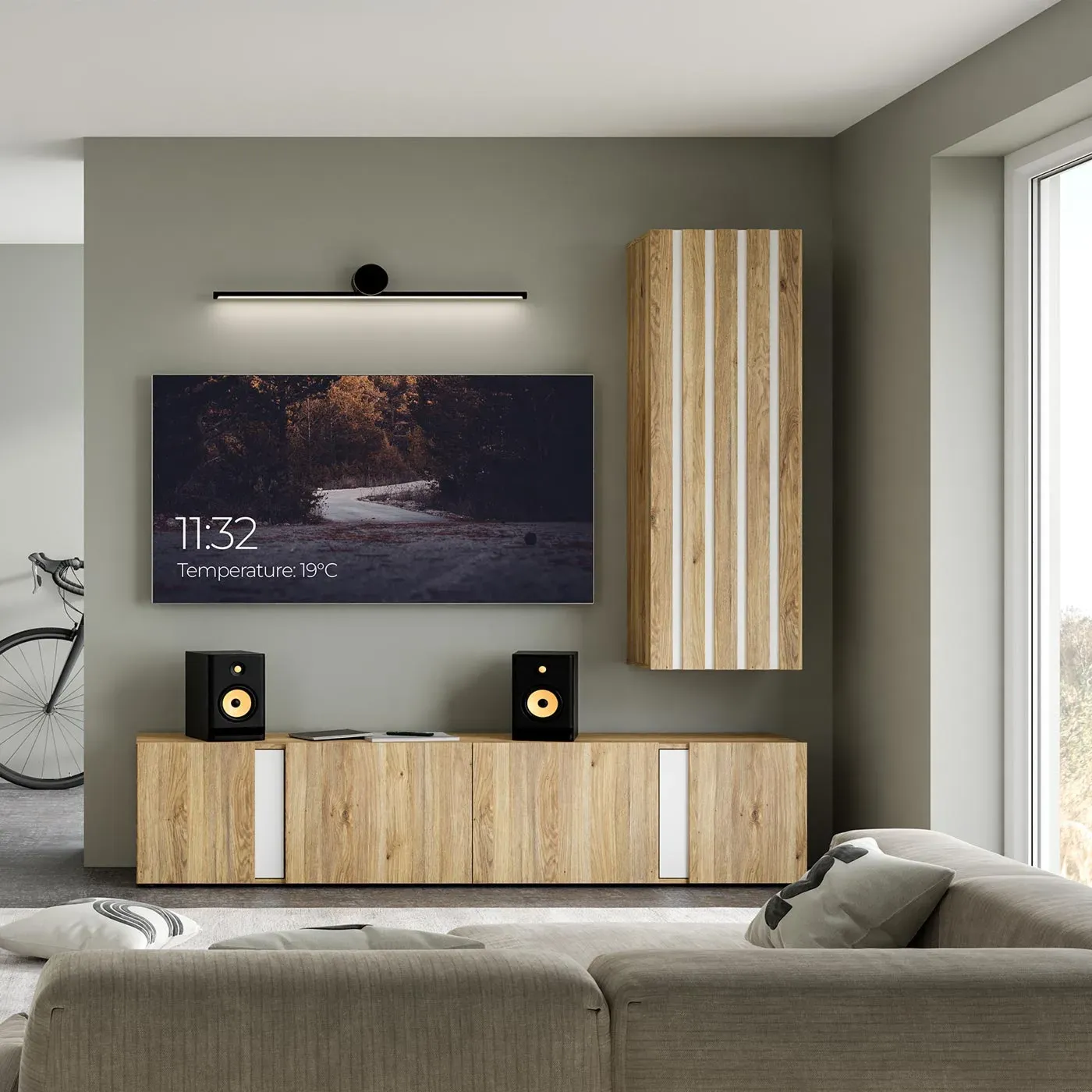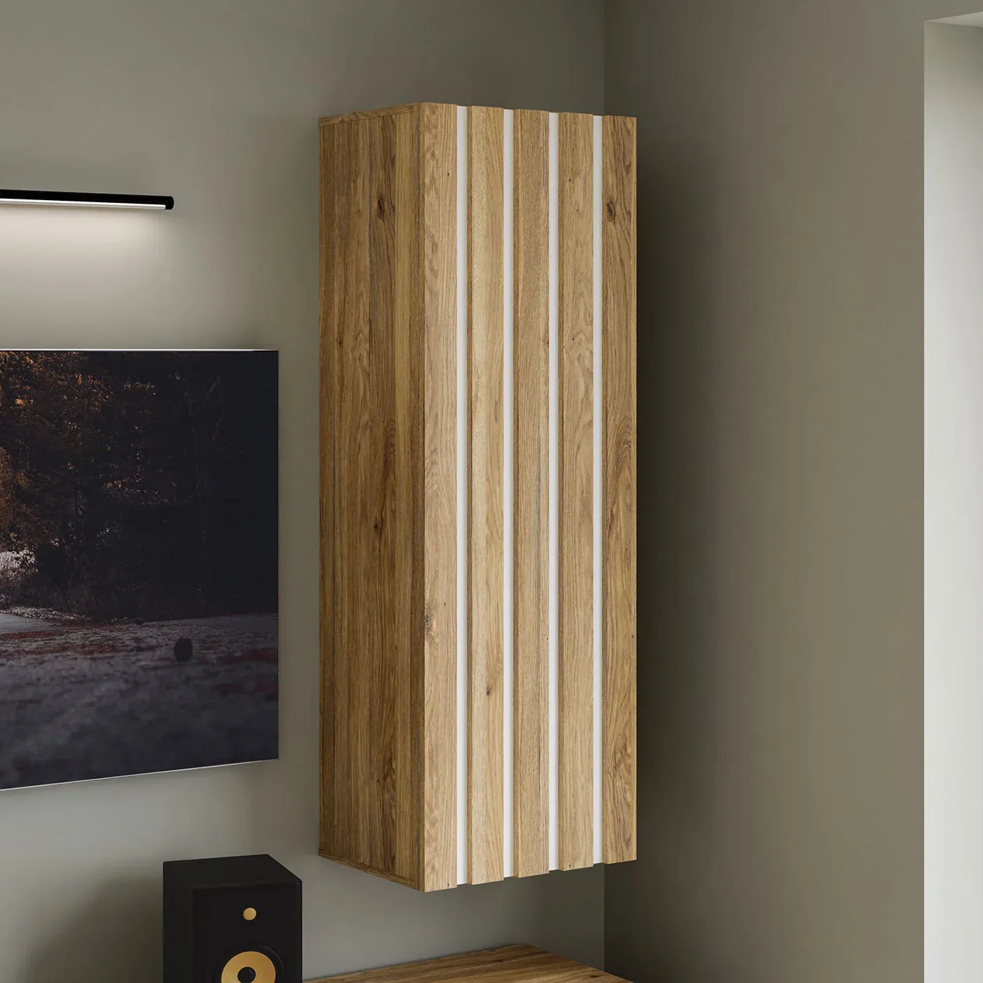 A caratterizza il pensile è una calda finitura tinta legno, il Rovere mauvella, che viene alternata da inserti bianchi, creando un piacevole effetto che dona al mobile uno stile moderno e di impatto.