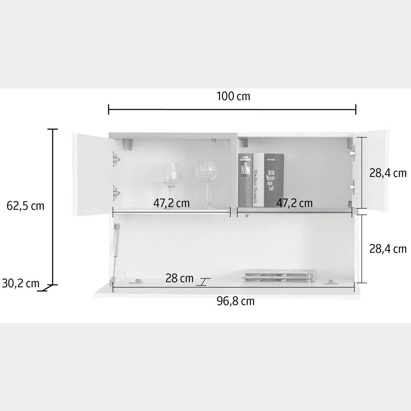 Il pensile è formato da una ribalta dotata di pistone per rallentare l'apertura e da 2 ante. Questa suddivisione dello spazio utile consente di posizionare molti oggetti.