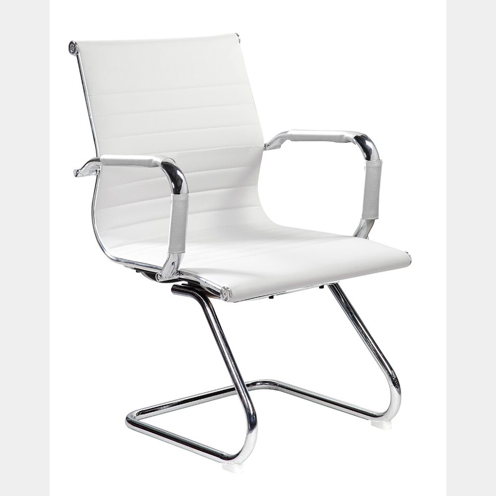 La struttura della poltrona è in acciaio cromato su slitta, laase cromata è dotata di gommini di sicurezza. Il rivestimento della seduta e schienale è in PU bianco. La poltrona presenta dei braccioli in acciaio cromato con copertura bianca in PU.