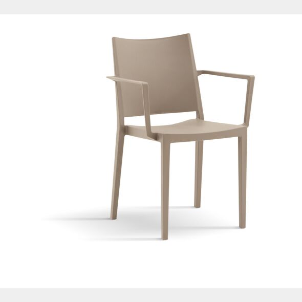 La sedia da esterno è in polipropilene con fibra di vetro tortora e si caratterizza grazie ai pratici e comodi manici.