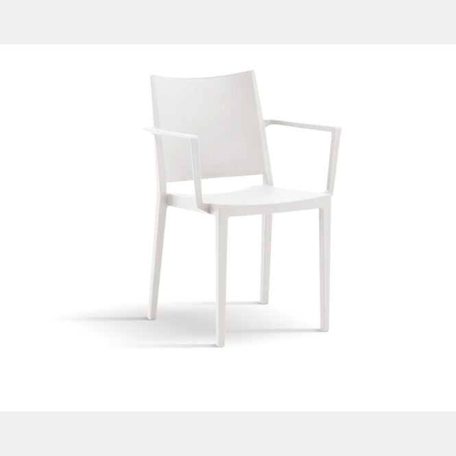 La sedia da esterno è in polipropilene con fibra di vetro bianco e si caratterizza grazie ai pratici e comodi manici.
