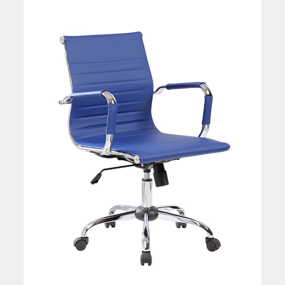 Meccanismo oscillante bloccabile e manopola per la regolazione di tensione per il peso del corpo consentono una corretta postura durante lo studio. Il rivestimento di seduta e schienale è in PU blu. L'appoggio delle braccia è consentito dalla presenza di braccioli in acciaio cromato con copertura blu in PU.