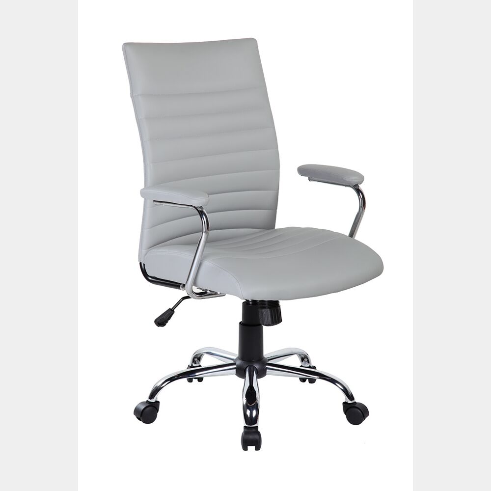 La poltrona è dotata di meccanismo oscillante bloccabile e manopola per la regolazione di tensione per il peso del corpo. Il rivestimento della seduta e schienale è in PU imbottito grigio. La poltrona è dotata di braccioli in acciaio cromato e la copertura grigia è in PU imbottito.