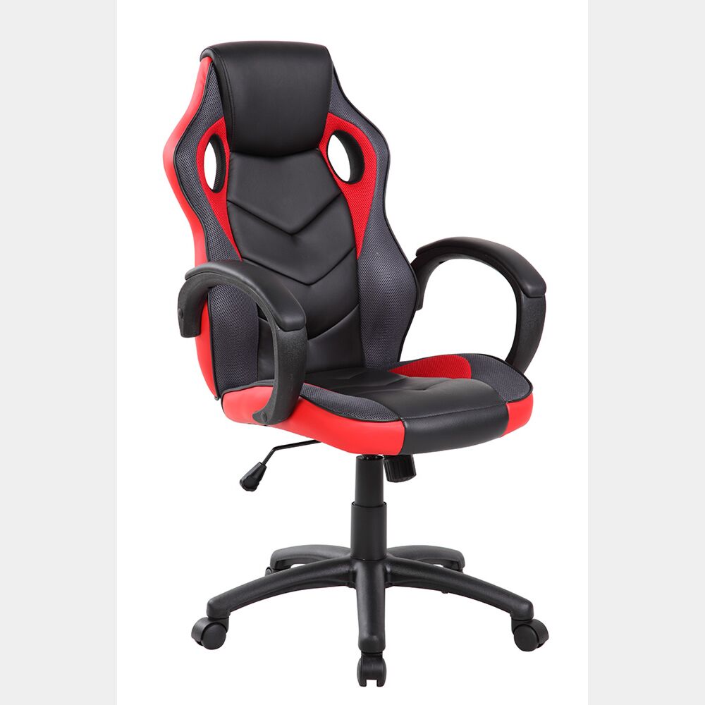 La poltrona Gaming è dotata di meccanismo oscillante bloccabile e manopola per la regolazione di tensione per il peso del corpo. Il rivestimento della seduta e schienale è in PU imbottito rosso e nero. La poltrona è dotata di braccioli in polipropilene nero con copertura nera in PU imbottito.