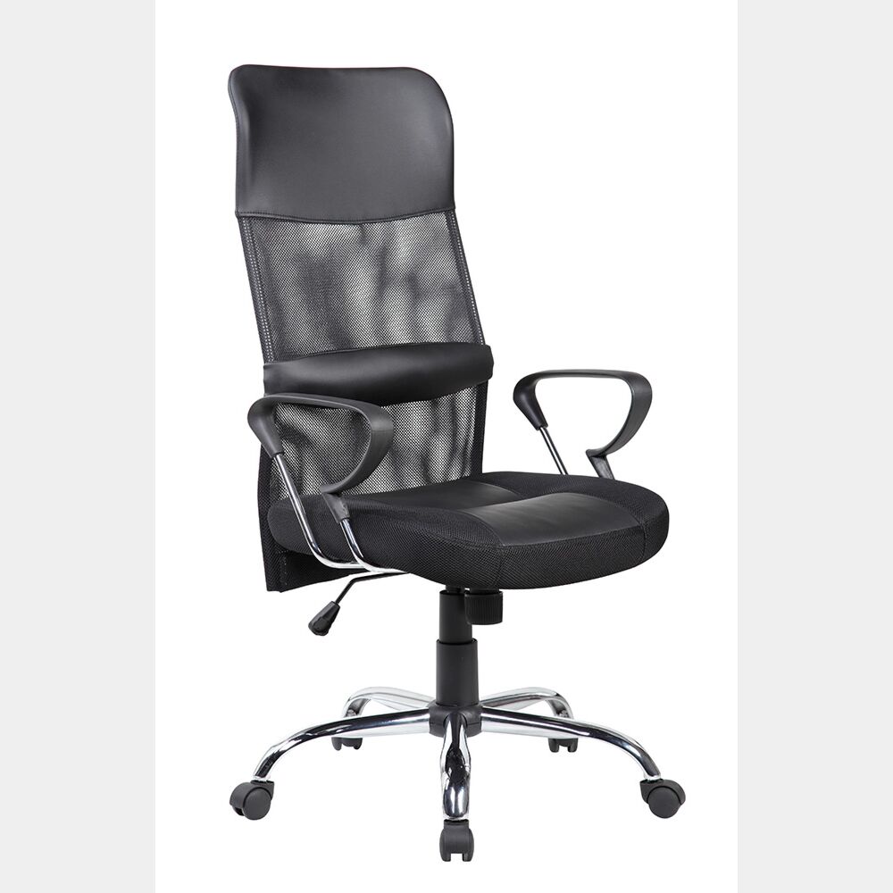 Grazie al meccanismo oscillante bloccabile e alla manopola per la regolazione di tensione per il peso del corpo è garantita una corretta postura durante lo studio/ lavoro. Il rivestimento della seduta è in PU e tessuto nero imbottito. Il rivestimento dello schienale è in PU e rete tecnica traspirante nera. La poltrona è dotata di braccioli in acciaio cromato con copertura nera in polipropilene.