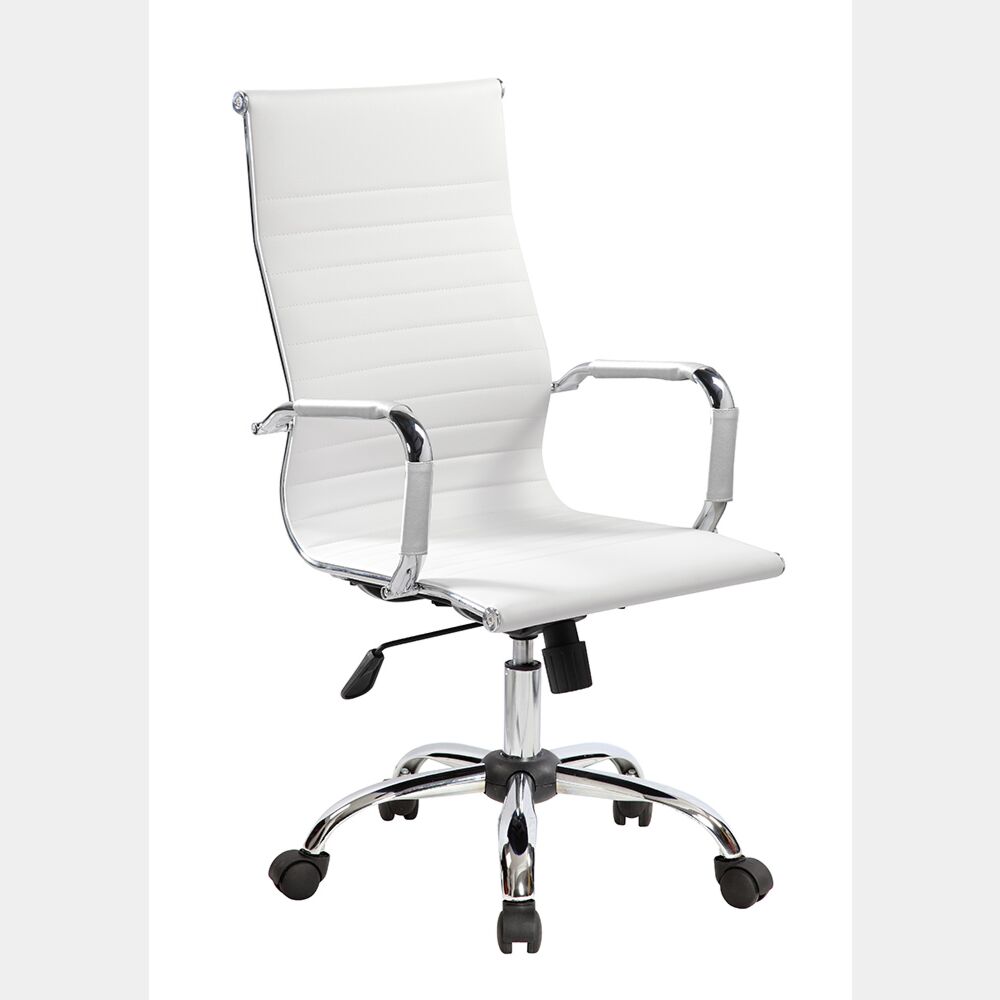 La poltrona è dotata di meccanismo oscillante bloccabile e manopola per la regolazione di tensione per il peso del corpo, viene garantita una corretta postura e comodità. Il rivestimento di seduta e schienale è in PU bianco, la poltrona è dotata di braccioli in acciaio cromato con copertura bianca in PU.