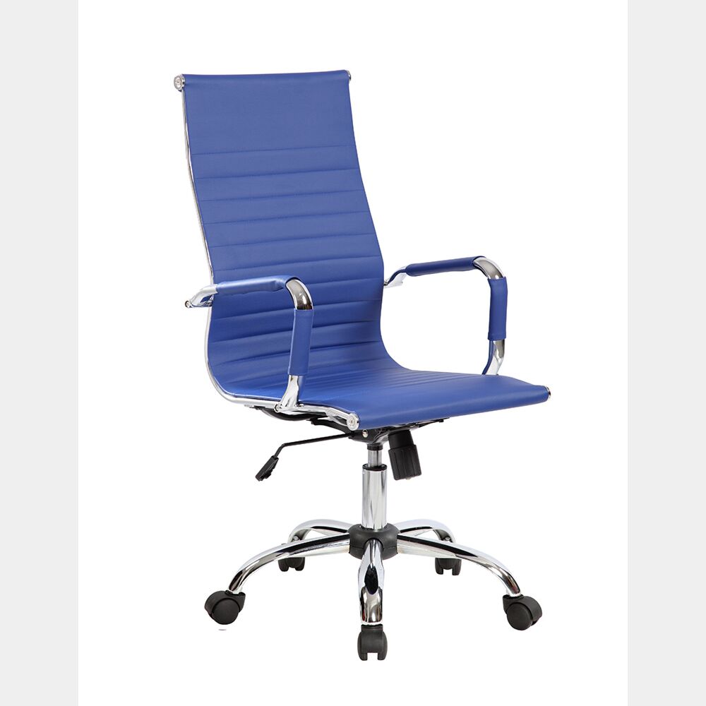 La poltrona è dotata di meccanismo oscillante bloccabile e manopola per la regolazione di tensione per il peso del corpo, viene garantita una corretta postura e comodità. Il rivestimento di seduta e schienale è in PU blu, la poltrona è dotata di braccioli in acciaio cromato con copertura blu in PU.