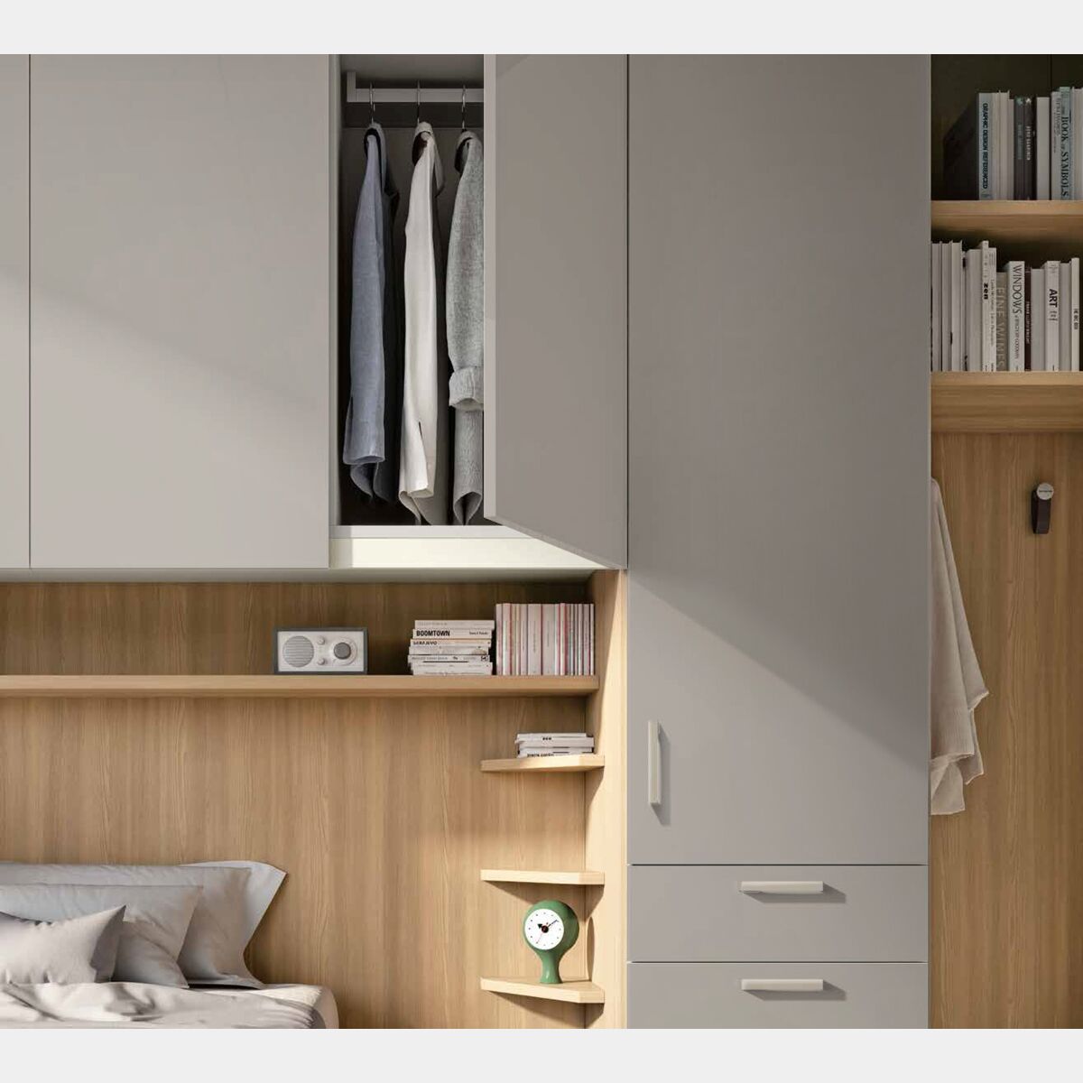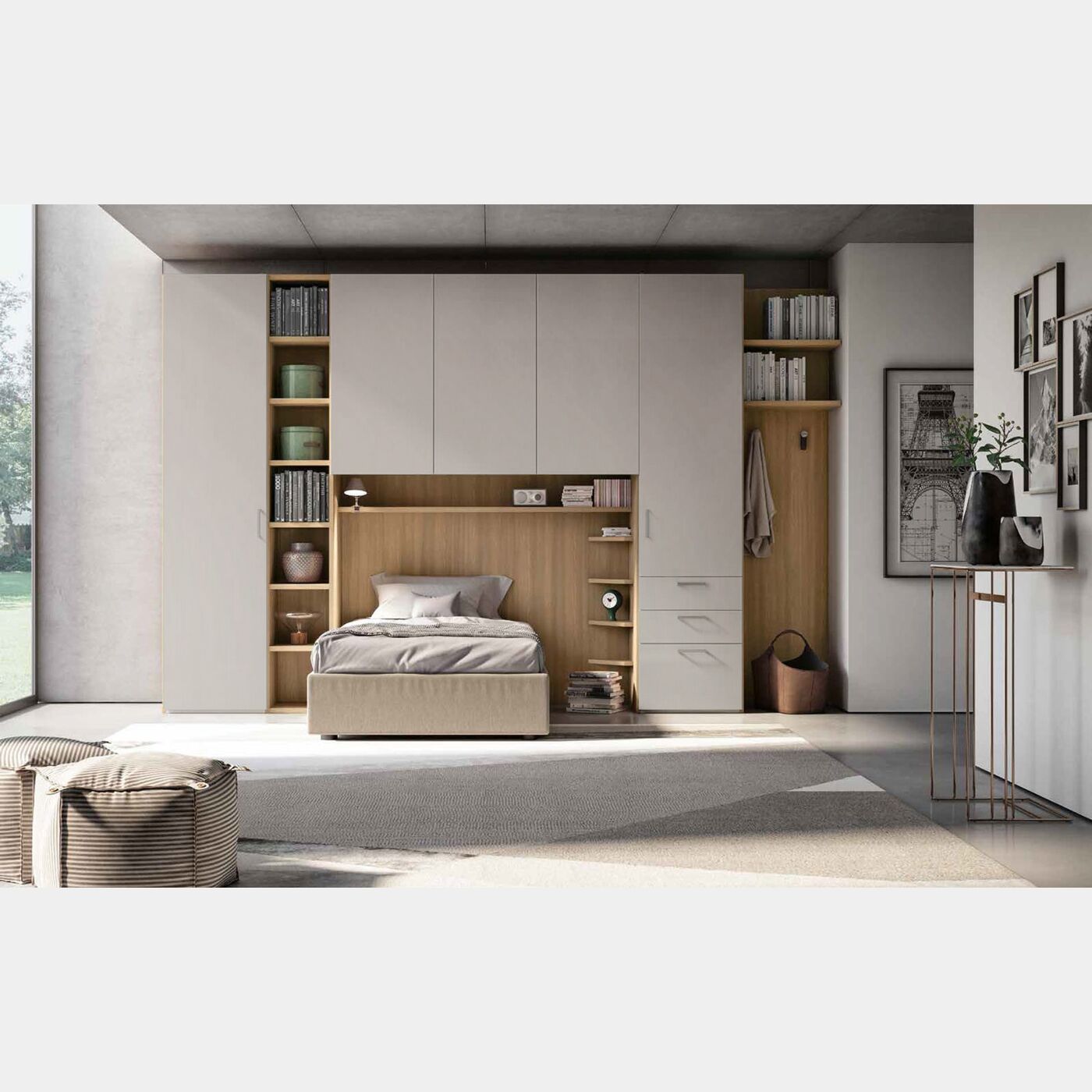 L'armadio a ponte è composto da un modulo da 60 con anta, una libreria con 6 ripiani, un modulo a ponte formato da 3 ante, un modulo da 60 con un'anta e 3 cassetti ed infine una boiserie con due mensole. La composizione assicura un'ampia capienza per abiti, coperte, cuscini, ma anche per complementi d'arredo che personalizzano la zona notte come libri, collezioni varie e altro.
