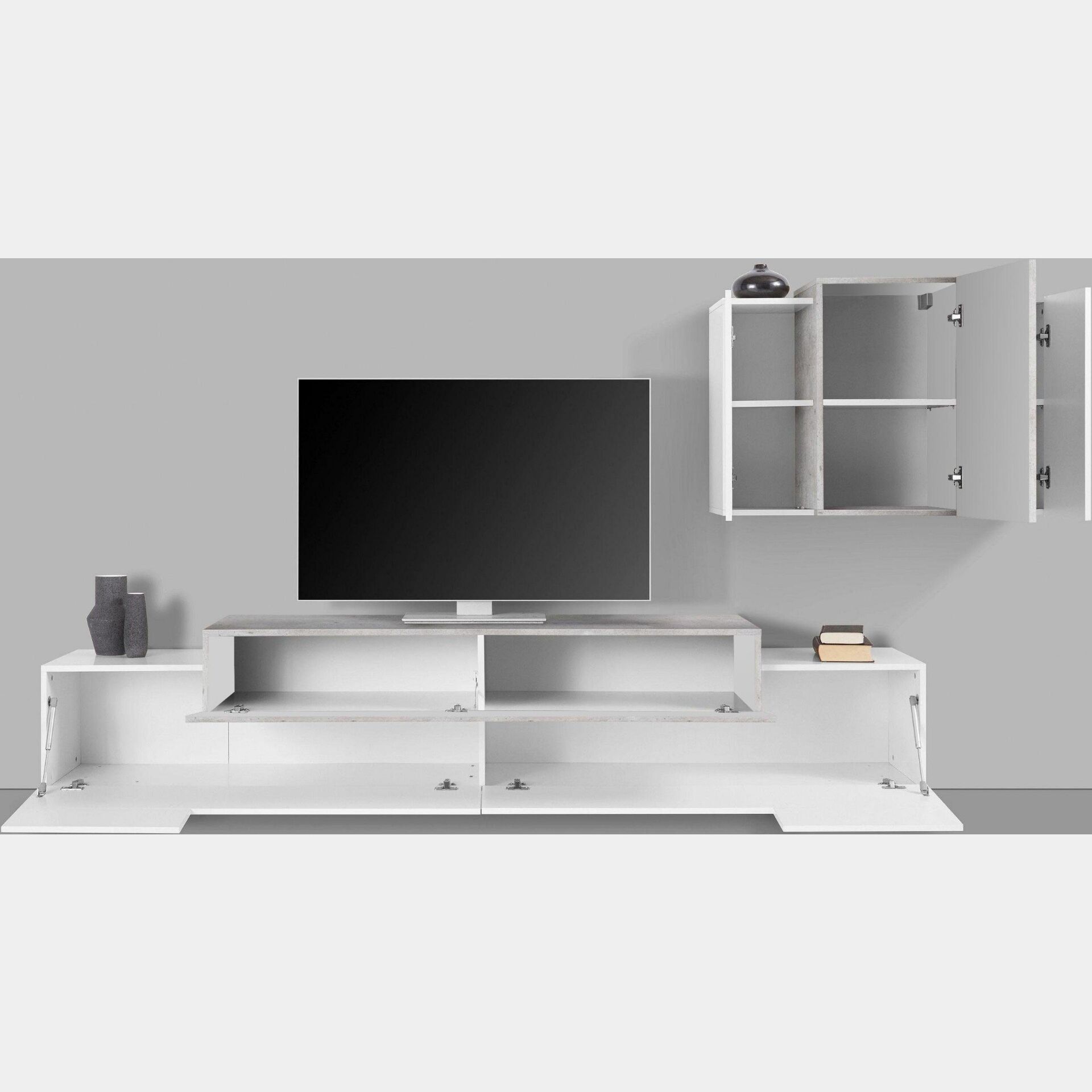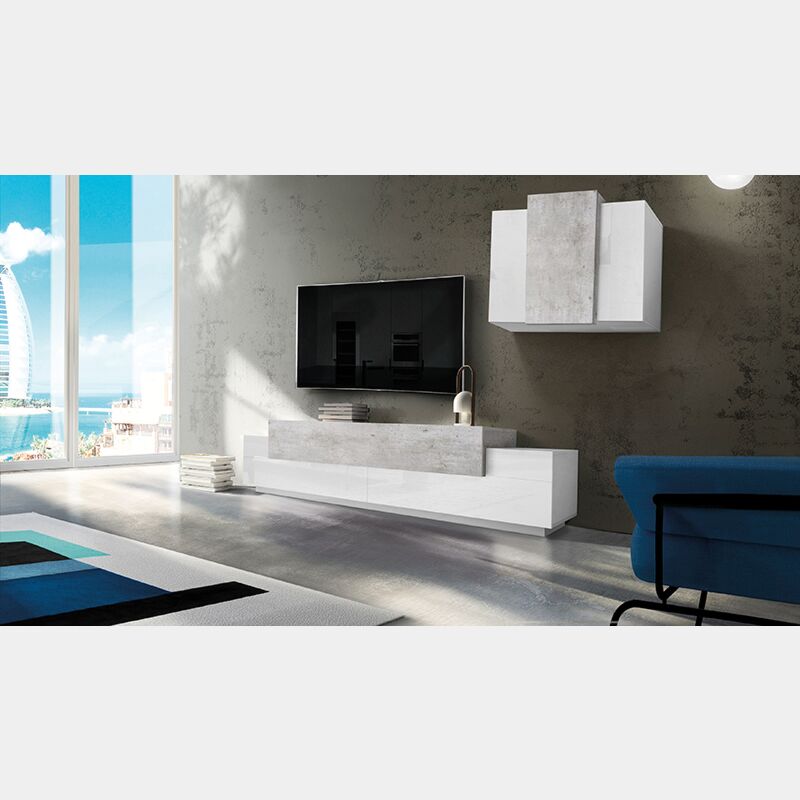 Porta Tv con pensile sospeso Bianco lucido e Cemento